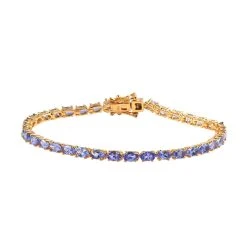 38 Tansanite, die einen erstklassigen Glanz aufweisen, sitzen auf diesem Armband, das sie auf einzelnen Stationen hält. Der Tansanit ist der Geburtsstein des Monats Dezember und gilt als 1.000x seltener als Diamanten. Dieses 7,9 Gramm Armband ist aus Silber mit Gelbgold Vermeil überzogen.