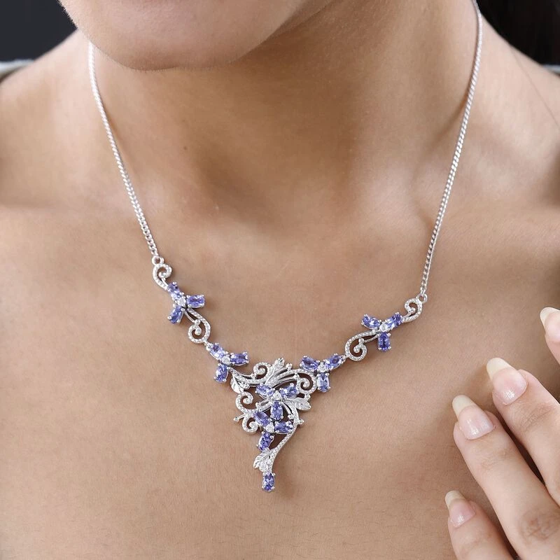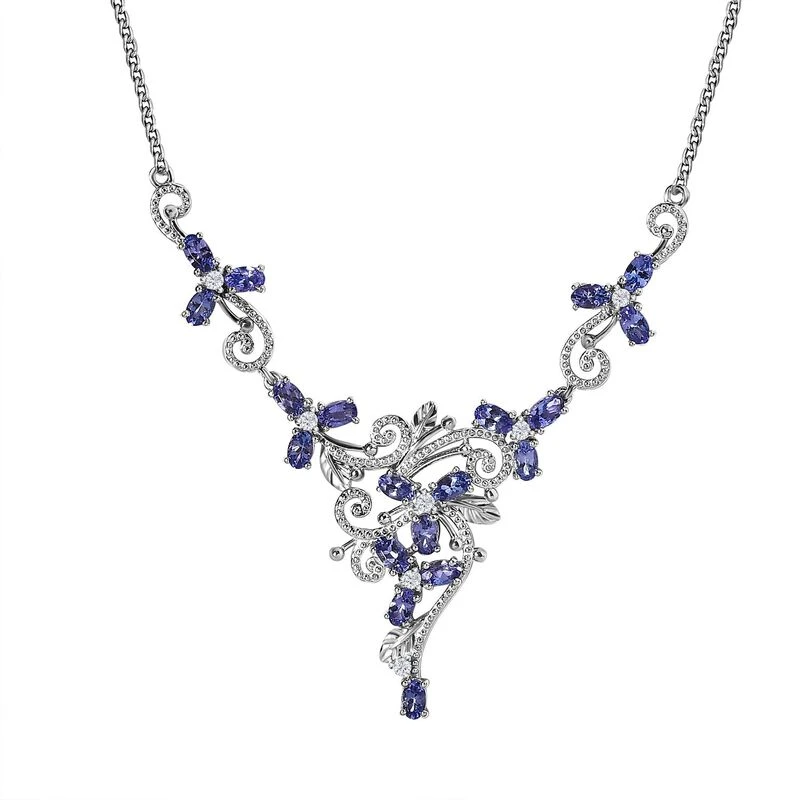 Diese florale Halskette zeigt die Schönheit des von der Natur inspirierten Designs. Verziert mit 19 Tansaniten und 7 Zirkonen, die das Design zum Leben erwecken, und mit einer Millgriff-Arbeit für zusätzliche Schönheit. Dieses 12,7 Gramm Schmuckstück aus platiniertem Silber wird mit einem Karabinerverschluss verschlossen.