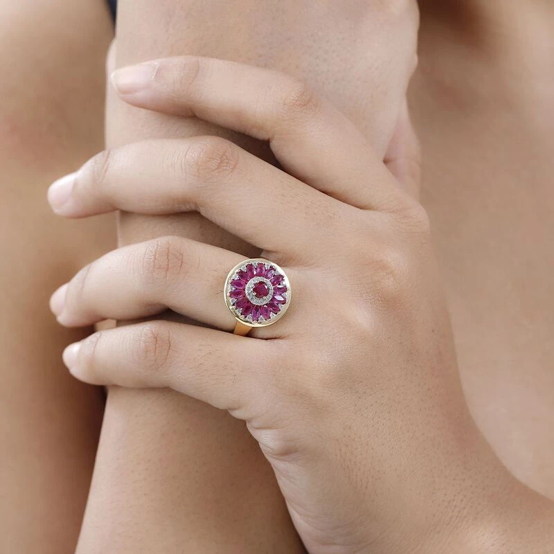 Dieser Cocktail-Ring für Damen ist ein Muss-have, wenn Sie auf der Suche nach auffälligem Schmuck für Ihre nächste Party sind. Dieser Ring für Damen ist mit 15 Rubinen (Fissure gefüllt) besetzt, die von 28 Zirkonen kontrastiert werden. 3,9 Gramm vergoldetes Silber fügt die königlichen Farbtöne dieses Rubin-Rings zu Ihrer Schmuckkollektion hinzu.