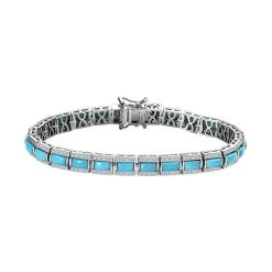 Dieses Türkis-Armband für Damen ist mit 29 Türkisen in Premiumqualität besetzt, dem einzigen Edelstein, dessen Farbe nach ihm benannt wurde. Dieses Eternity-Armband für Damen wird von 232 Zirkonen umrahmt, die für das perfekte Funkeln sorgen. Die schlanke Silhouette dieses 17,6 Gramm Armbands glänzt in platiniertem Silber und wird mit einem Kastenverschluss geschlossen.