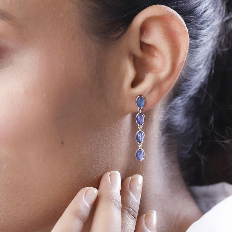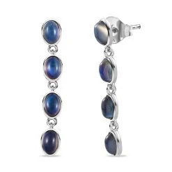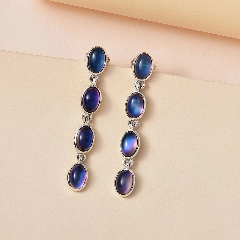 Genießen Sie die wunderschönen, vom Nordlicht inspirierten Farbtöne von 8 Aurora-Mondsteinen, die an Ihren Ohrläppchen baumeln. Die Ohrringe sind mit Steckverschlüssen versehen und der Rahmen ist aus platiniertem Silber gefertigt.
