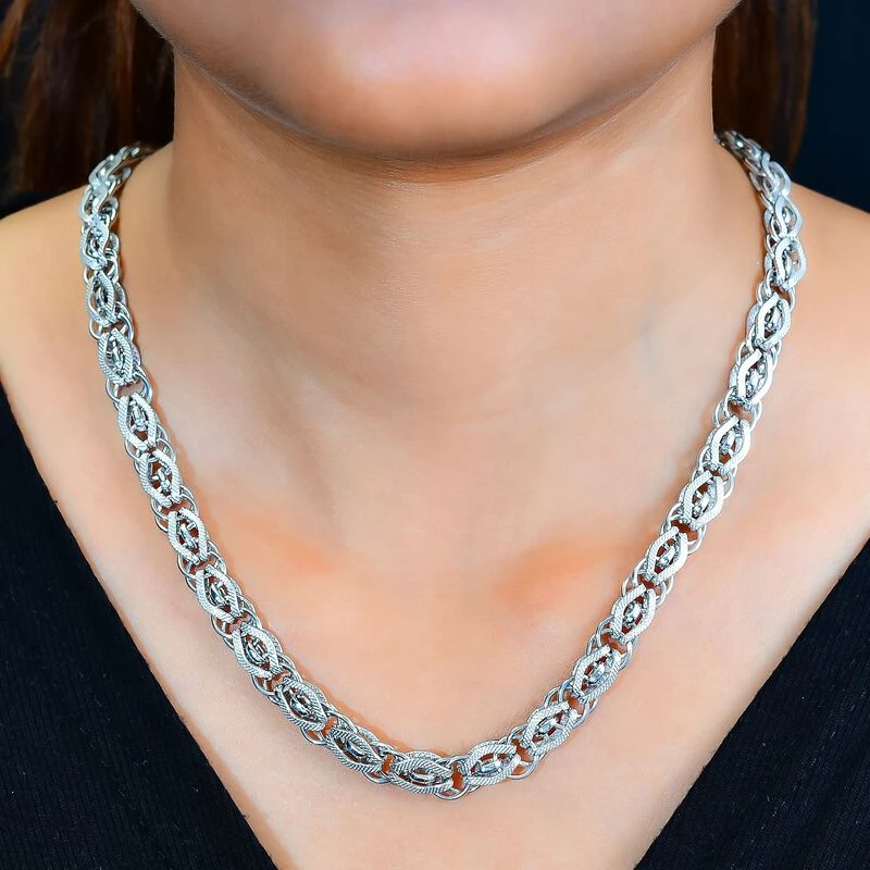 Das klobige Design der Halskette zeigt die Komplexität des Flechtens ihrer Glieder. Die Halskette ist das perfekte Accessoire, um alle Aufmerksamkeit auf sich zu ziehen. Sie ist aus 38 Gramm platiniertem Silber gefertigt. Der Karabinerverschluss sichert seine gewagte Schönheit.