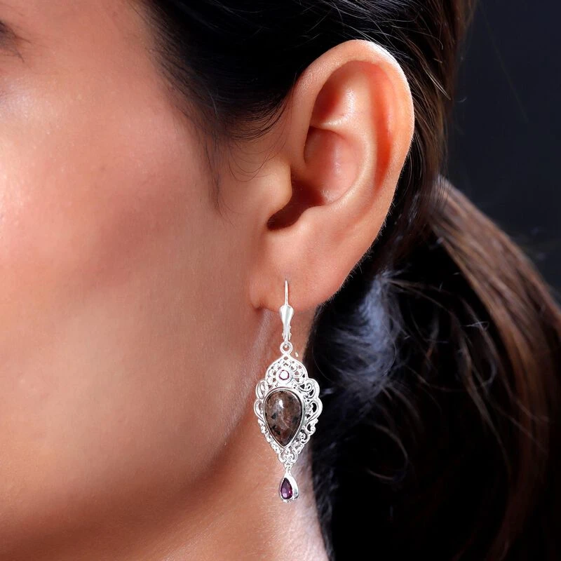 Handgearbeitete, Natürliche Yooperlith Und Rhodolith Granat-Ohrringe, 925 Silber Ca. 6,74 Ct