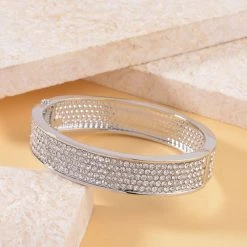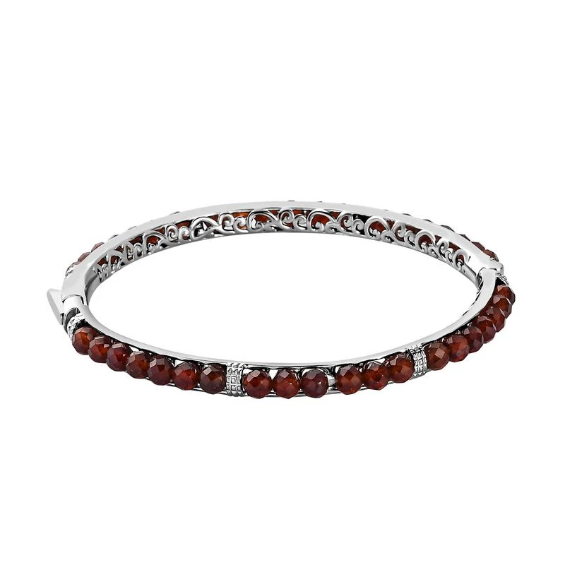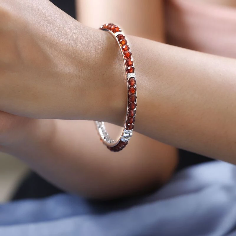 Dieser von der Ewigkeit inspirierte Armreif ist mit 46 tiefroten Hessonit-Granaten besetzt, die sich über die gesamte Länge des Armreifs erstrecken. Der 15,6 Gramm Armreif ist mit wunderschönen Schnörkeln im inneren Rahmen versehen und wird mit einem Klickverschluss gesichert.