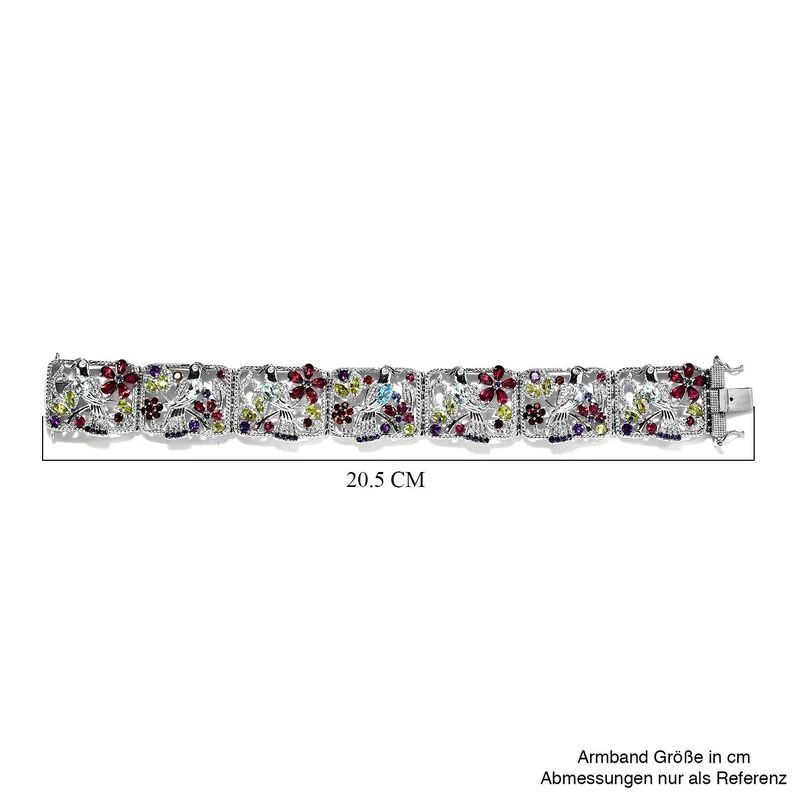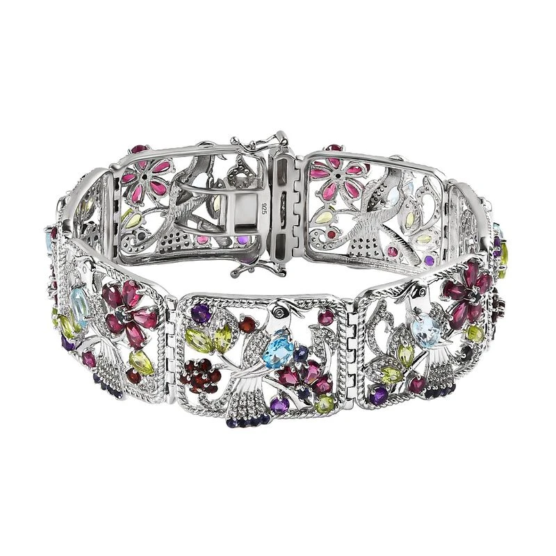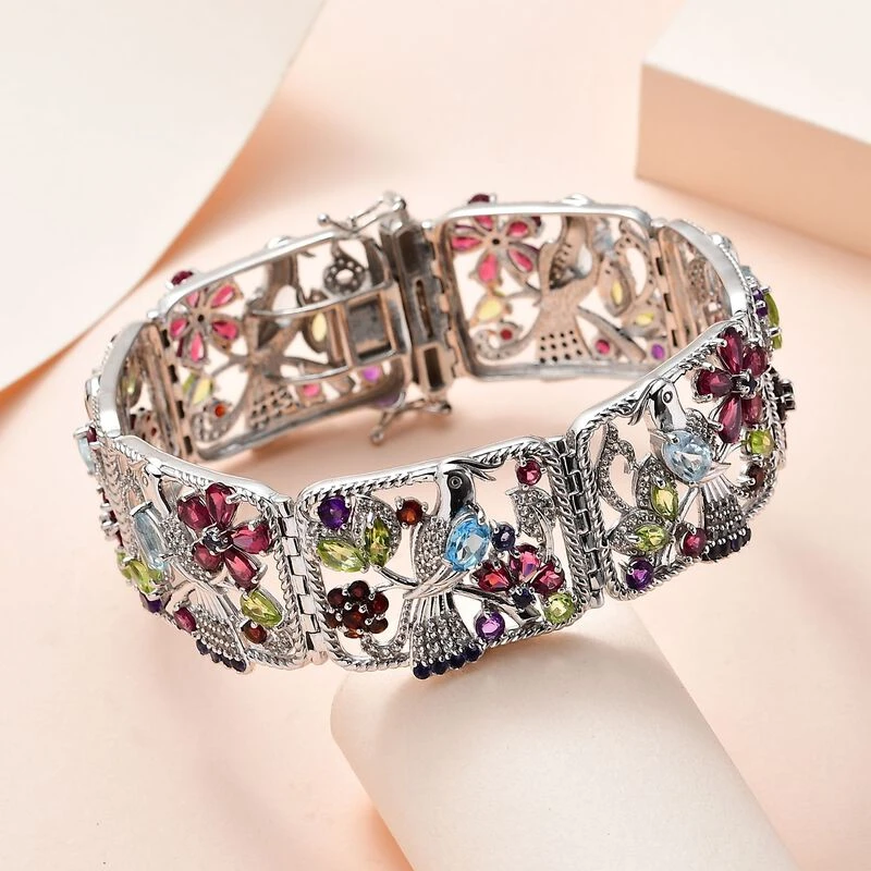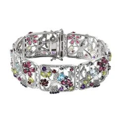 Setzen Sie Schmucktrends mit diesem gewagten Armband mit mehreren Edelsteinen, das von Schmuckkünstlern mit viel Liebe zum Detail kunstvoll gestaltet wurde. Die einzelnen Segmente sind durch Scharniere verbunden und aus 44,5 Gramm platiniertem Silber gefertigt, das mit einem Kastenverschluss gesichert wird.