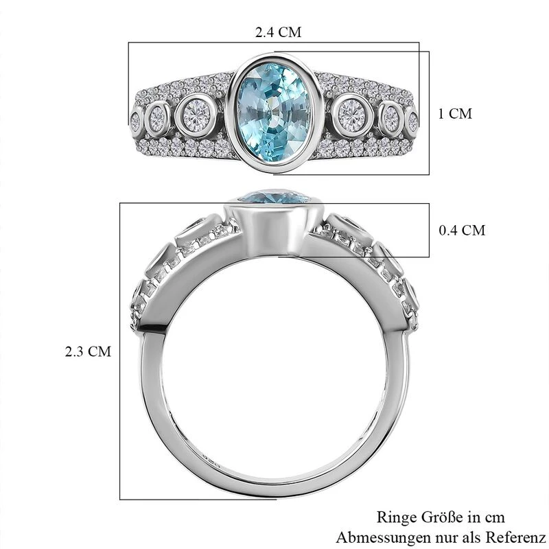Weiße Wolken, die den blauen Himmel umgeben, inspirieren diesen blauen Zirkon in Kombination mit weißen Zirkon. Mit einem Hauch von Schmuckdesigns der Art-Déco-Bewegung bietet dieser Ring einen ovalen, blauen Zirkon in der Mitte des Rings. Der zentrale Edelstein ist in einer Zargenfassung gefasst. 40 weiße Zirkone schmücken diesen Ring und sorgen für eine einzigartige Brillanz.