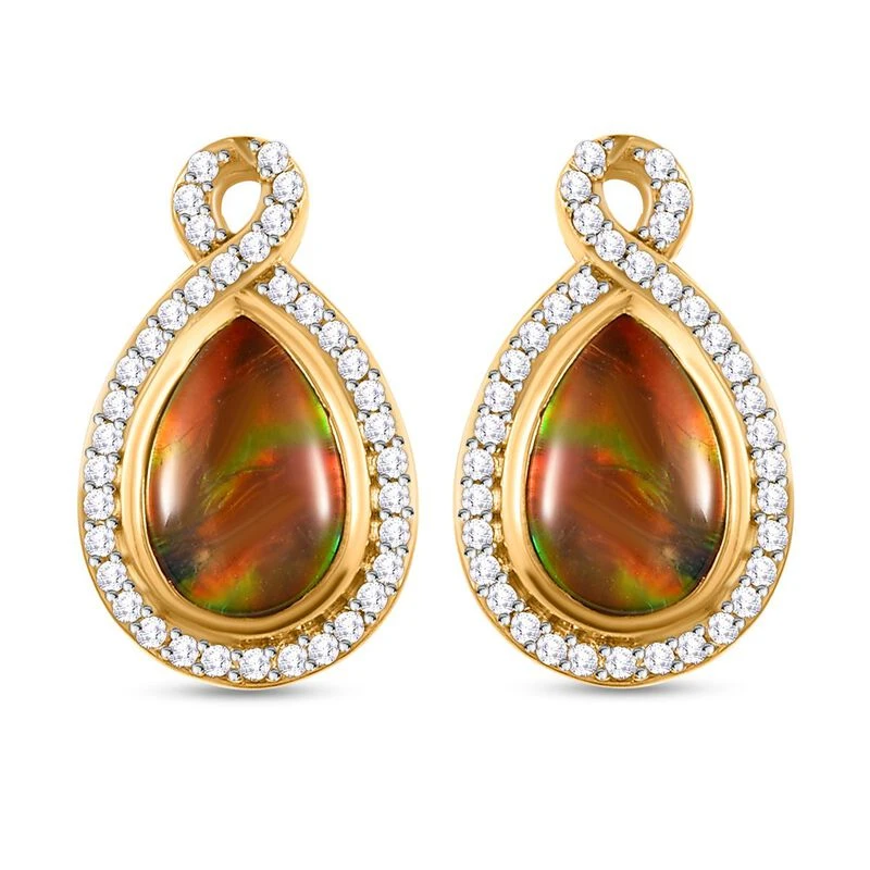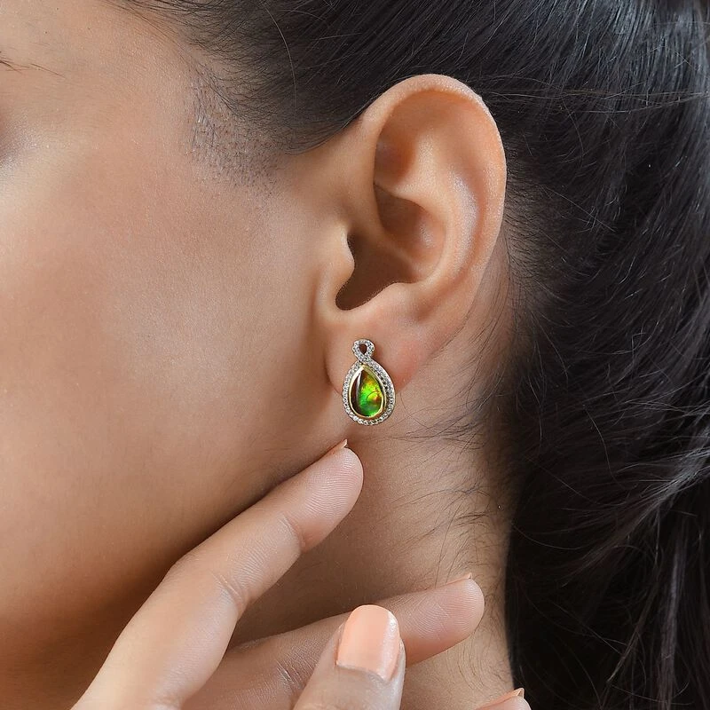 Kanadische Ammolit Und Weiße Zirkon-Ohrringe, 925 Silber Gelbgold Vermeil Ca. 2.85 Ct