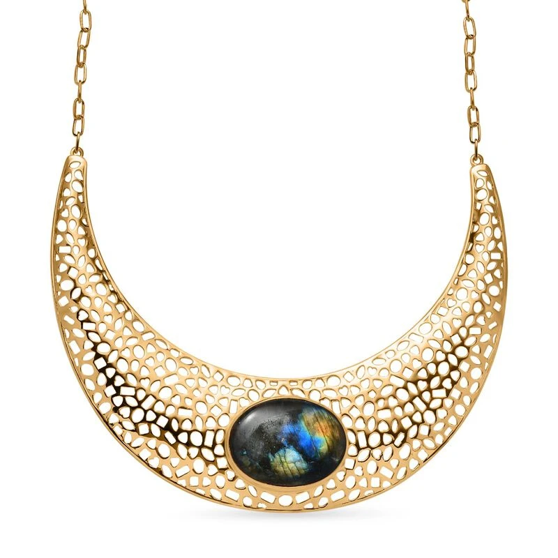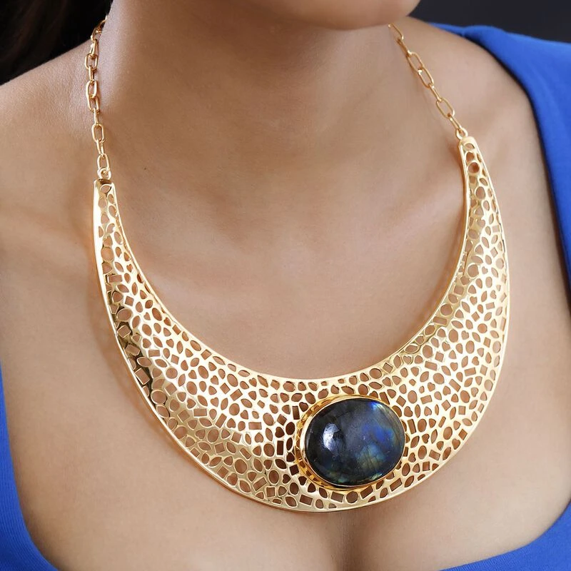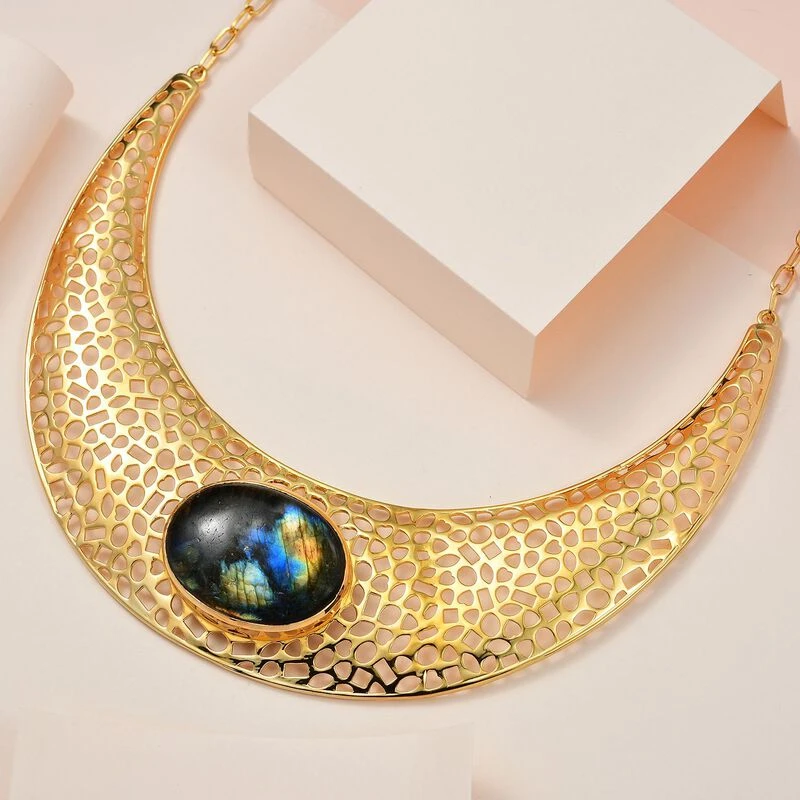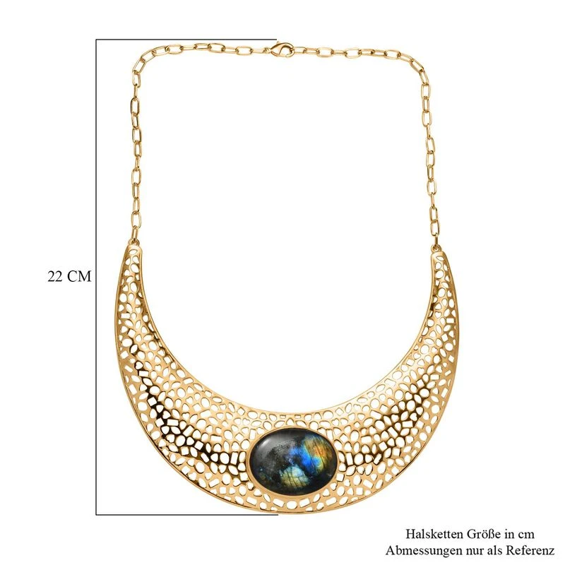 Ein Solitär-Labradorit, der für seine schillernden Farben bekannt ist, sitzt auf der Halskette in vergoldetem 925 Silber. Die kühne Halskette im Choker-Stil hat ein Cut-out-Design und kann mit einem Karabinerverschluss getragen werden.