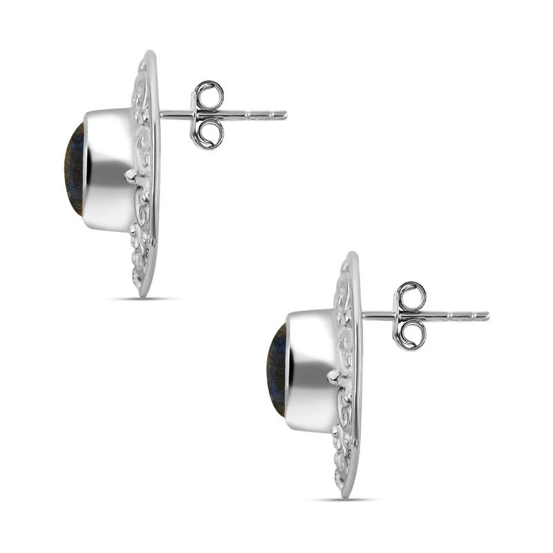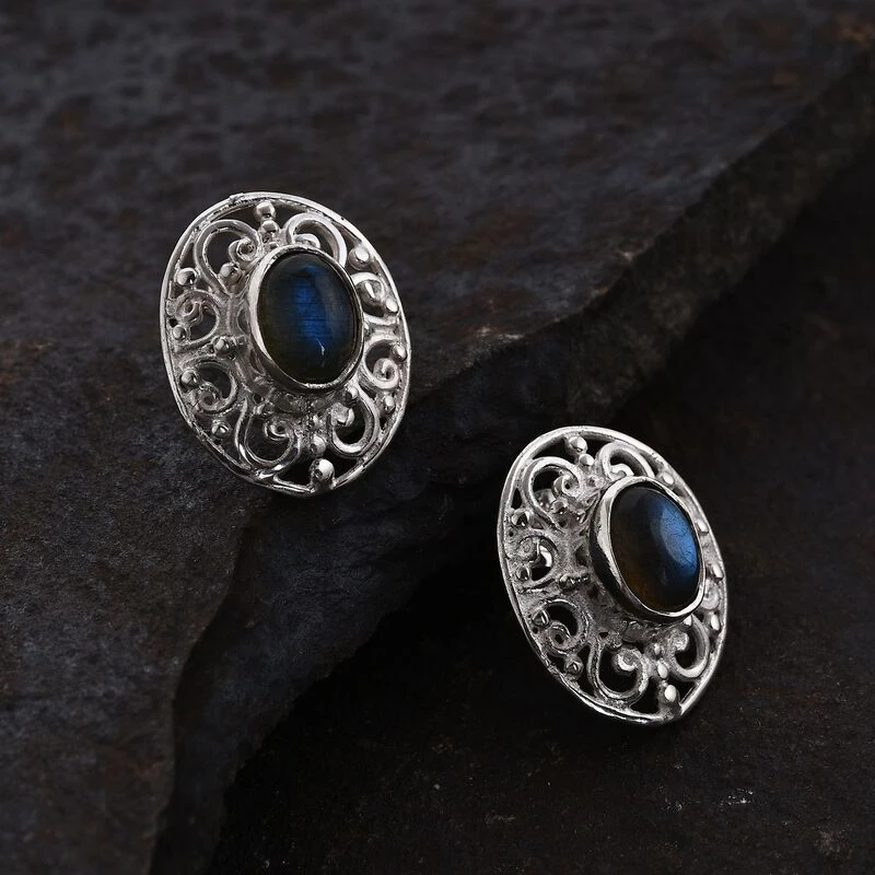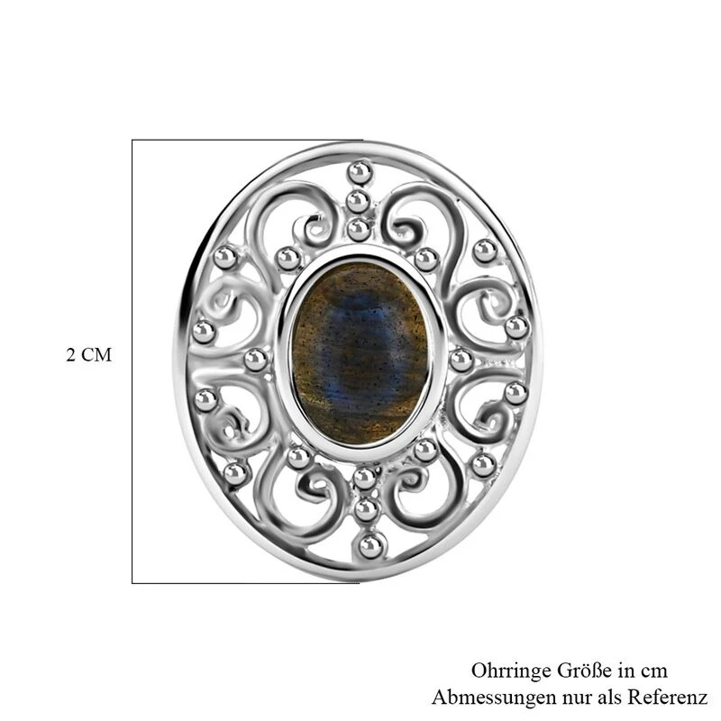 Diese kunstvollen Ohrstecker sind mit 2 schillernden Labradoriten besetzt, die die Aufmerksamkeit auf die Schnörkel lenken. Die 3,6 Gramm schweren Ohrringe aus 925er Silber können mit Steckverschlüssen getragen werden und sind dank ihrer hypoallergenen Beschaffenheit hautfreundlich.