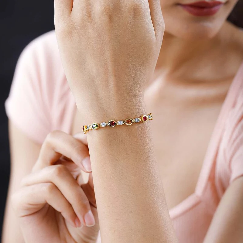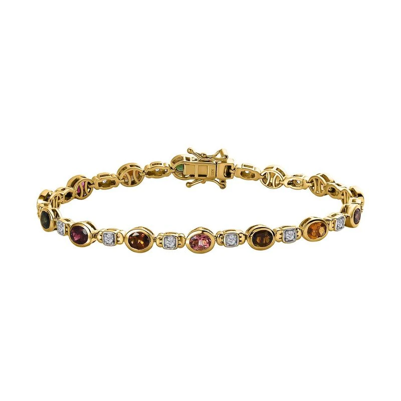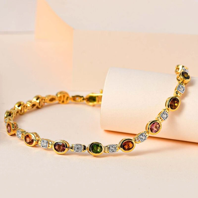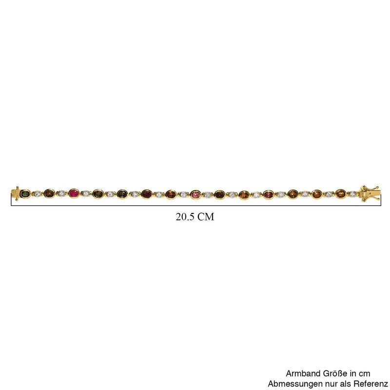 Mehrfach-Turmalin, Weißer Zirkon Armband Ca. 19 Cm 925 Silber Vergoldet Ca. 5.70 Ct
