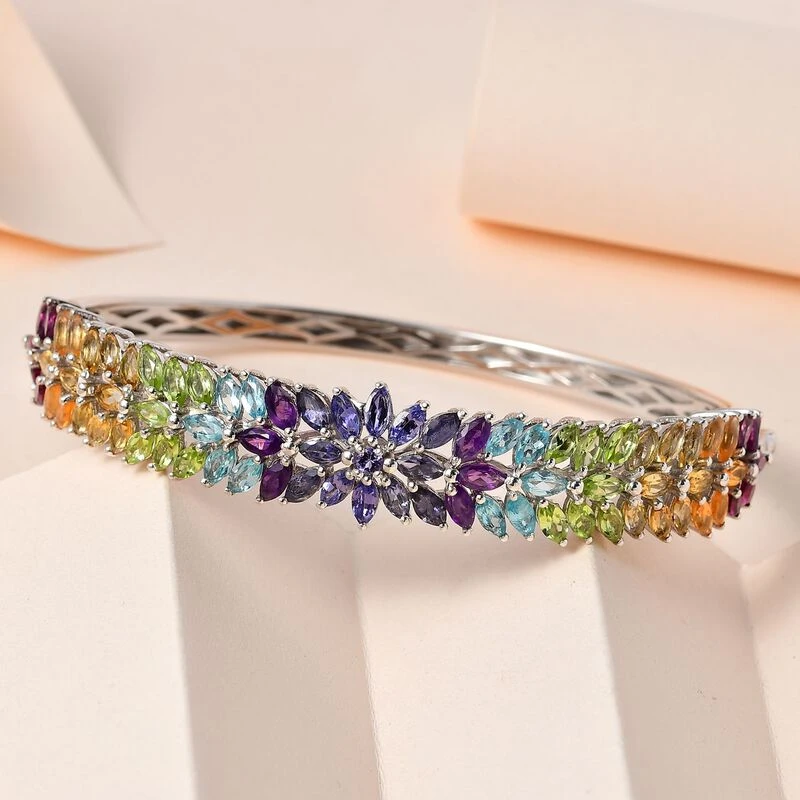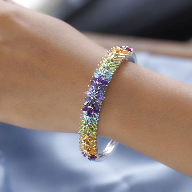 Mehrfarbiger Edelstein Armreif, Ca. 19 Cm 925 Silber Platiniert Ca. 12.34 Ct