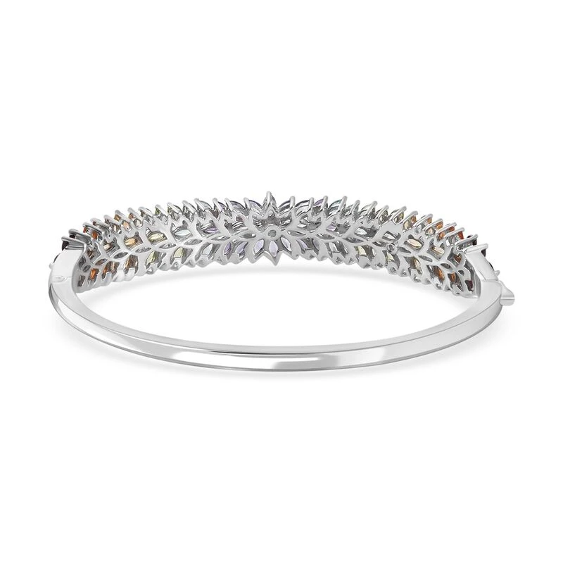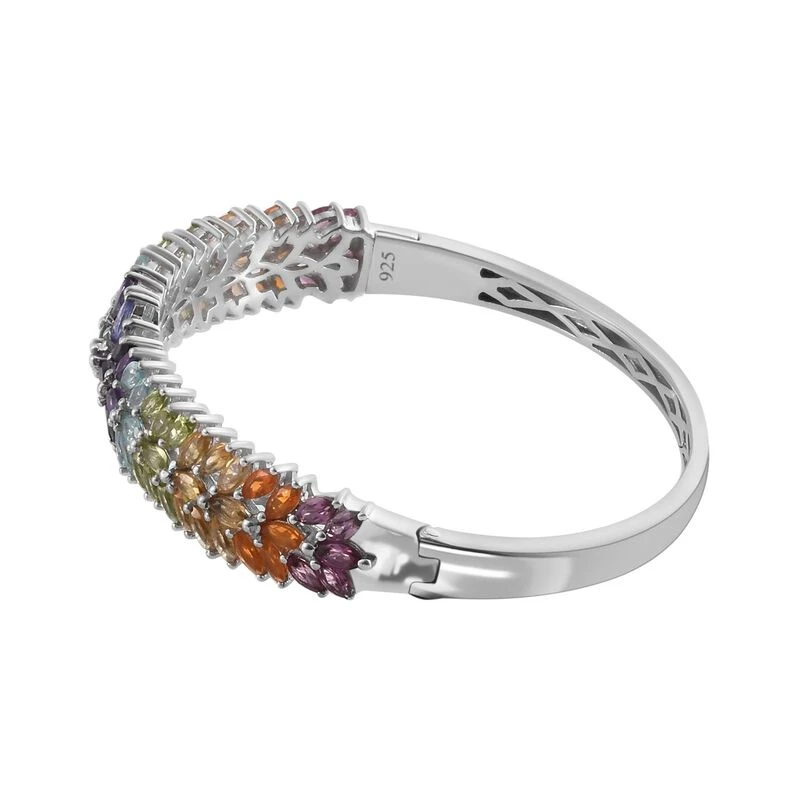 Dieser Armreif fängt die schönen Farben des Regenbogens ein und ist mit den mehrfarbigen Tönen von insgesamt 86 Edelsteinen besetzt, die in 23 Gramm platiniertes Silber gefasst sind. Gesichert durch einen Klick-Verschluss, bringt der Armreif jeden Look zum Leben.