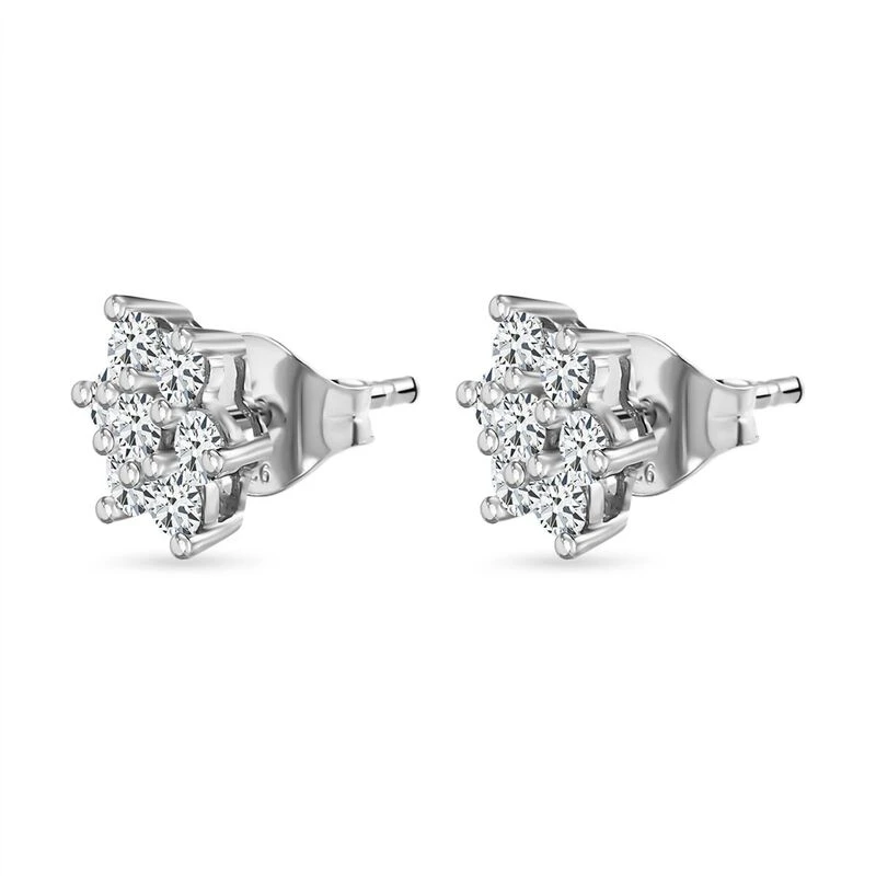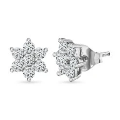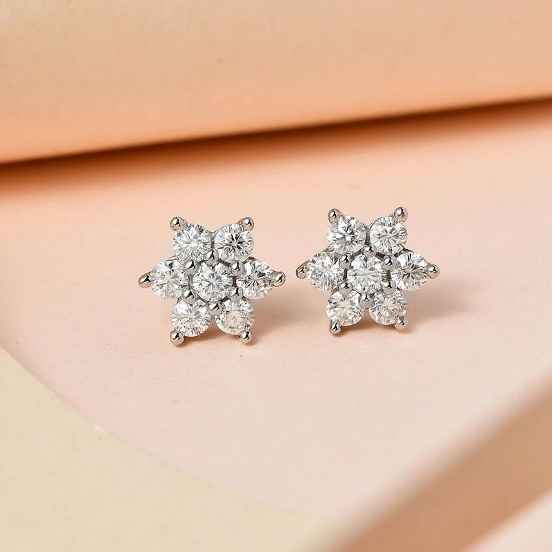 Das Cluster-Paar ist von der Schönheit der Blumen inspiriert. 14 Moissanite glänzen mit ihrer überragenden Brillanz auf dem Design, das von Hand facettiert wurde. Der Rahmen dieser 1g Ohrringe mit Steckverschlüssen ist aus platiniertem Silber gegossen.