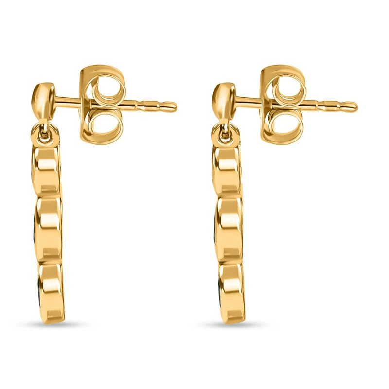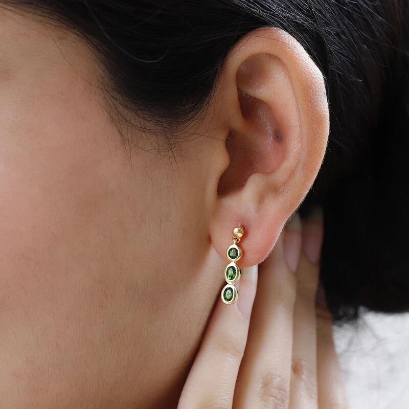 Diese Trilogie-Ohrringe für Damen repräsentieren die Vergangenheit, Gegenwart und Zukunft der Trägerin und sind mit den waldgrünen Farbtönen von 6 Chromdiopsiden geschmückt. Diese 2 Gramm Ohrringe für Damen aus vergoldetem Silber werden mit Steckverschlüssen befestigt.