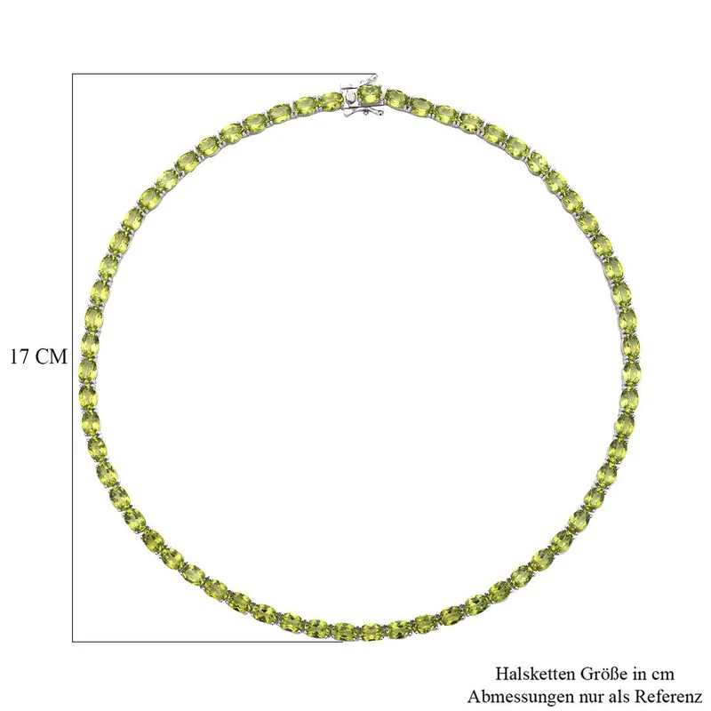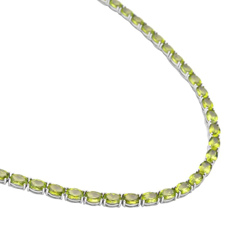 Diese Halskette für Damen ist für ihre leuchtenden olivgrünen Farbtöne bekannt und ist über die gesamte Länge mit Peridot verziert. Die Peridot-Halskette ist im Eternity-Muster gestaltet, das die immerwährende Liebe symbolisiert. Die rhodinierte Silber-Halskette mit Peridot wiegt 15,9 Gramm und wird mit einem Kastenverschluss geschlossen.