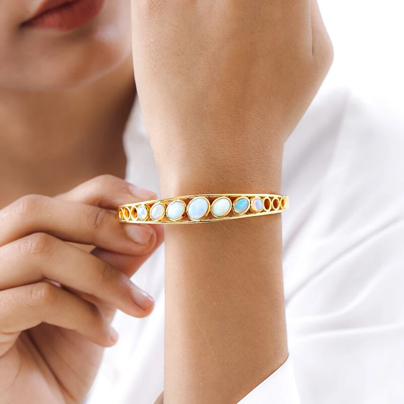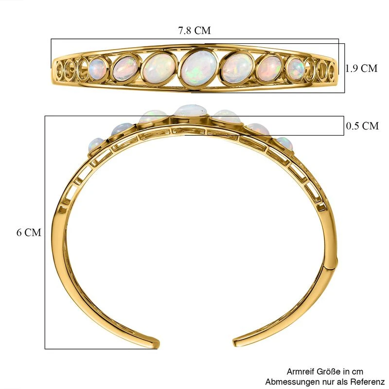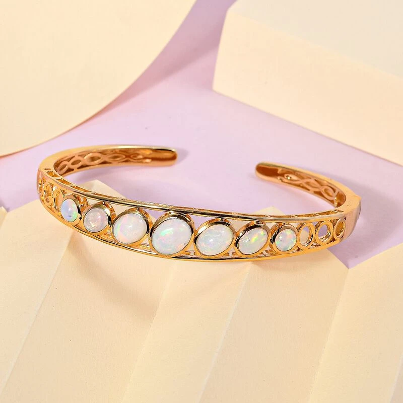 7 schillernde Opale in verschiedenen Größen schmücken die Schönheit dieses Armreifs für Frauen. Dieser 19cm Armreif mit Welo-Opalen, dem Geburtsstein des Monats Oktober, ist vielseitig einsetzbar, um Sie vom Schreibtisch bis zur Tanzfläche zu begleiten. Er ist aus 20 Gramm vergoldetem Silber gegossen.