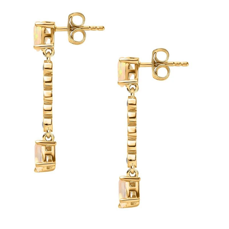 Verleihen Sie Ihren Looks einen Hauch von Farbe mit 4 Opalen, die auf dem oberen und baumelnden Segment des Paares verziert sind, verbunden mit 10 Zirkonen für einen verspielten Tanz an Ihren Ohrläppchen. Die Ohrringe mit Steckverschlüssen sind aus 2,3 Gramm vergoldetem Silber gefertigt.