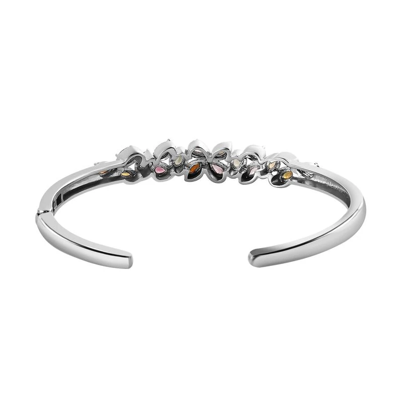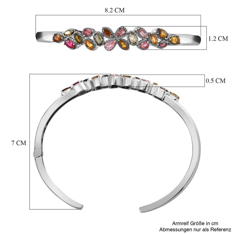 Dieser Armreif für Damen ist mit einem floralen Muster versehen, das Ihren femininen Charme unterstreicht. Mit dem Glanz von 18 mehrfarbigen Turmalinen wird dieser Armreif für Damen zum Leben erweckt. Für zusätzliche Schönheit ist dieser 13,9 Gramm Armreif mit Millgriff-Arbeit verziert.