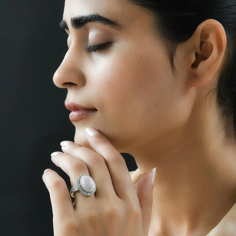 Dieser wunderschöne Opal-Cocktailring ist mit den errötenden Farbtönen eines rosafarbenen Opals geschmückt, umrahmt von 52 Zirkonen, die sich bis zu den Schultern des Rings erstrecken. Der Ring ist aus 6 Gramm platiniertem Silber gegossen, um Haltbarkeit und Opulenz zu gewährleisten. Der Opalring ist elegant und zeitlos und wird jedem Outfit einen Hauch von Luxus verleihen.