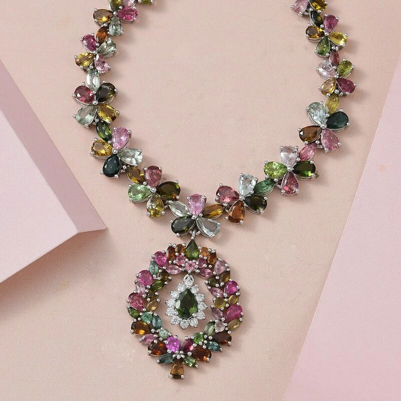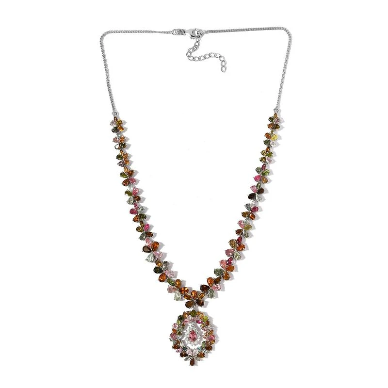 Diese Halskette ist ein echtes Erbstück. 153 mehrfarbige Turmaline sind von der Länge bis zum mittleren Anhänger in leuchtenden Farben gehalten. 12 Moissanite sind um den baumelnden Turmalin herum angeordnet und verleihen ihm ihren feurigen Glanz in einem 20 Gramm Design aus platiniertem Silber.