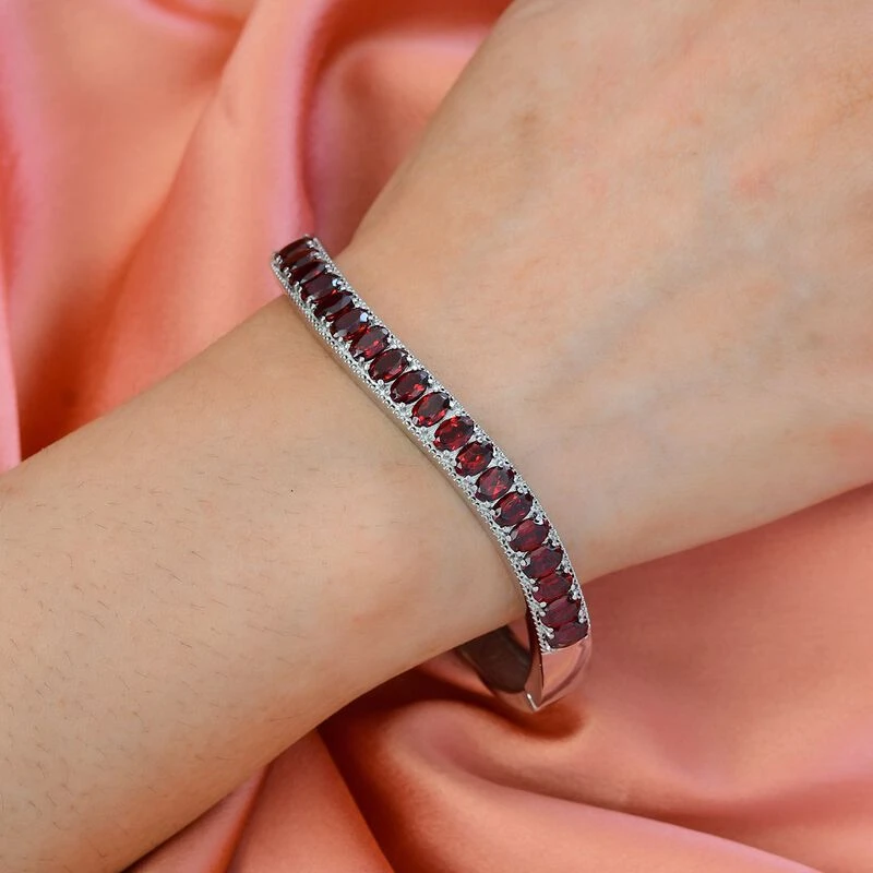 Dieser Armreif ist mit den leuchtenden Farben von 19 Granaten verziert, die einen tiefroten Farbton aufweisen und ihm einen einzigartigen Look verleihen. Ein Klickverschluss sichert diesen Armreif.