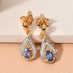 AA Tansanit Und Zirkon Ohrringe 925 Silber Gelbgold Vermeil Ca. 0.75 Ct