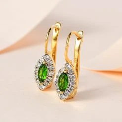 Natürlicher Chromdiopsid, Weißer Zirkon Ohrringe 925 Silber Vergoldet Ca. 0.97 Ct