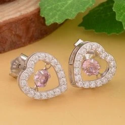 Rosa Und Weiße Zirkonia Ohrringe In Herzform, 925 Silber Rhodiniert, Ca. 1.50 Ct