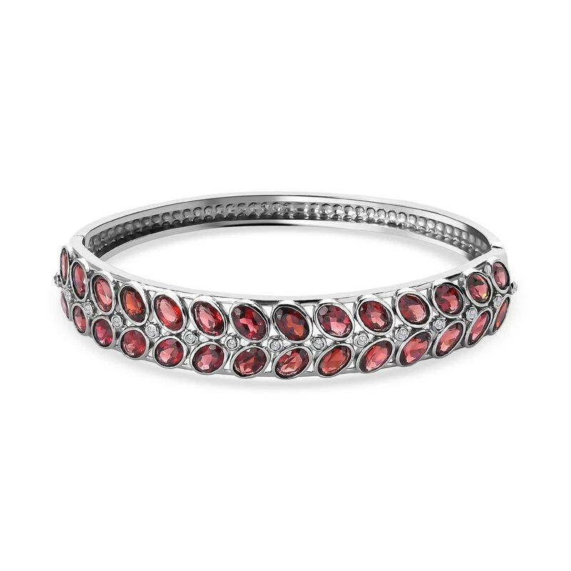 Der Geburtsstein des Monats Januar, 28 Granate, schmücken die Vorderseite dieses Armreifs, der von 15 Zirkonen flankiert wird. Der Armreif hat eine kühne Ausstrahlung, die die tiefroten Farbtöne des Granats zur Geltung bringt. Tragen Sie diesen eleganten Armreif mit einem Click-Verschluss.