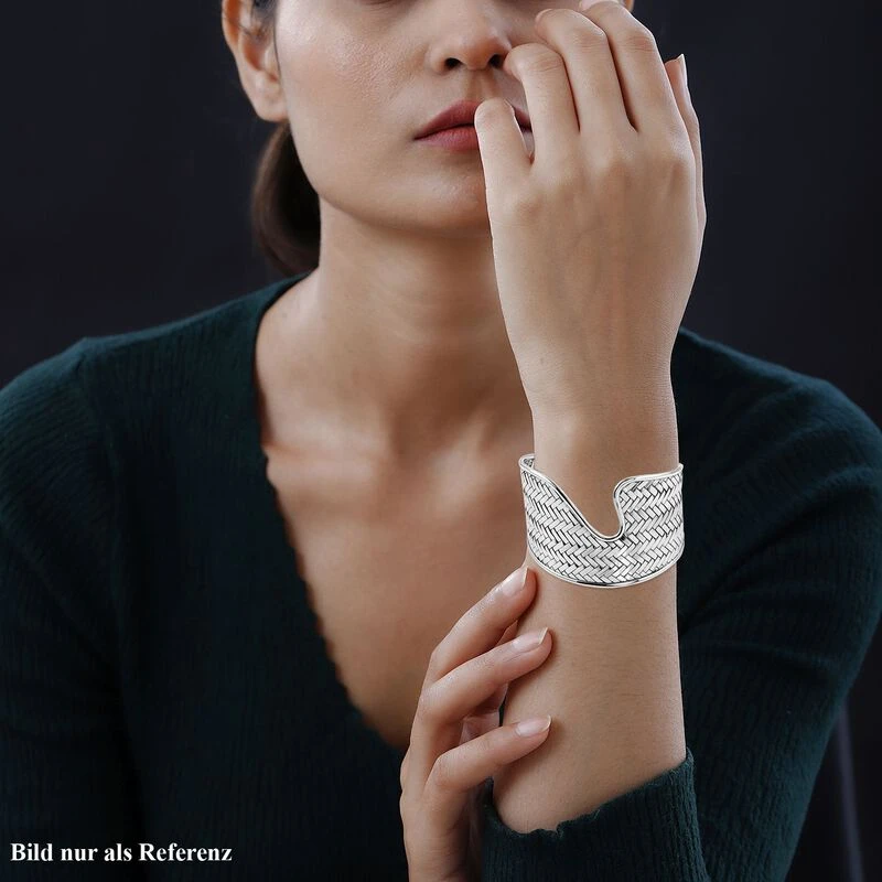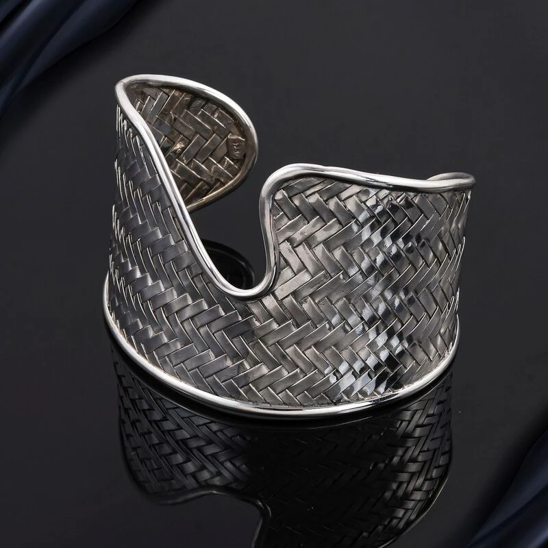 Dieser handgefertigte Silber-Armreif ist der perfekte Weg, um Ihrem Ensemble einen besonderen Look zu verleihen. Der einzigartige Armreif für Damen im zeitgenössischen Stil hat ein kompliziertes Korbgeflecht-Design und ist in 36,6 Gramm gegossen. Der Armreif ist einfach zu stylen und hält mit den aktuellen Schmucktrends Schritt.