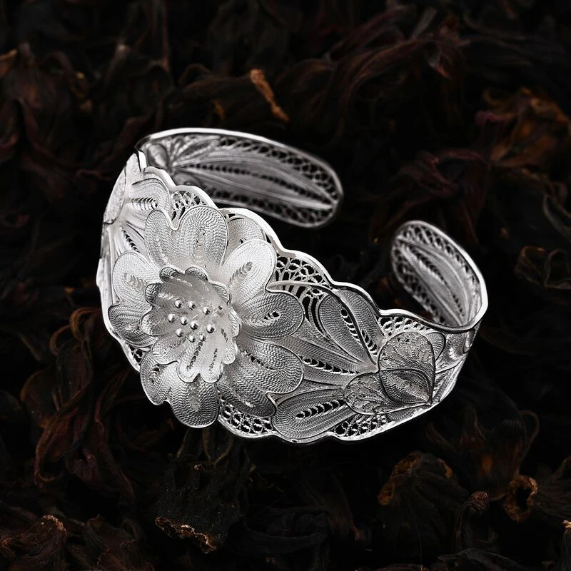 Der komplizierte Rahmen der filigranen Motive in Kombination mit den Millgriff-Arbeiten machen die Schönheit dieses Designer-Armreifs aus. Die gewagte Silhouette dieses Armreifs aus 24 Gramm Silber wird von balinesischen Kunsthandwerkern in Handarbeit gefertigt, die sich von der Natur inspirieren lassen, was ihn zum perfekten Party-Armreif für Damen macht.