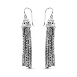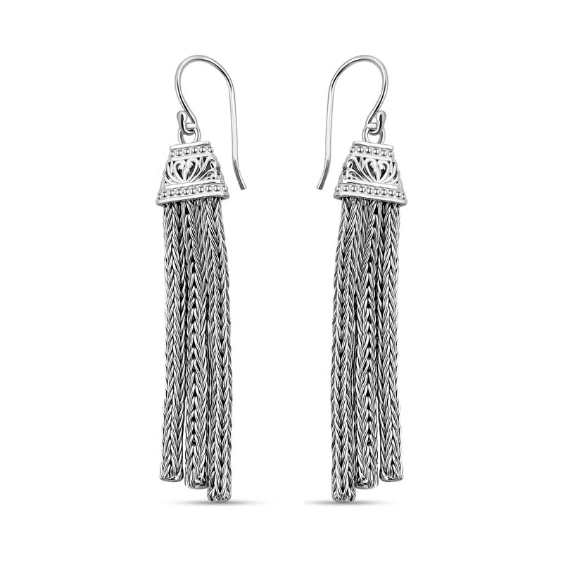 Diese Silber-Ohrringe für Damen zeichnen sich durch das Tulang Naga-Geflecht aus, das auf Balinesisch auf das Rückgrat eines Drachens anspielt. Die 3-strängigen Ohrringe für Damen sind aus 10,6 Gramm handgefertigt und mit der Schönheit filigraner Arbeiten verziert. Hakenverschlüsse sichern diese Schönheiten.