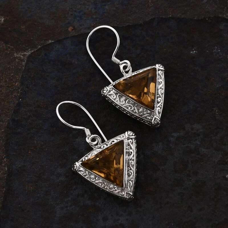 Diese handgefertigten Designer-Ohrringe für Damen zeigen die Kunstfertigkeit von Bali. Handgefertigte Schnörkel umgeben den schönen, warm gefärbten Citrin in einem Solitär-Design. Diese Silber-Ohrringe für Damen werden mit Hakenverschlüssen getragen und wiegen 8,5 Gramm.