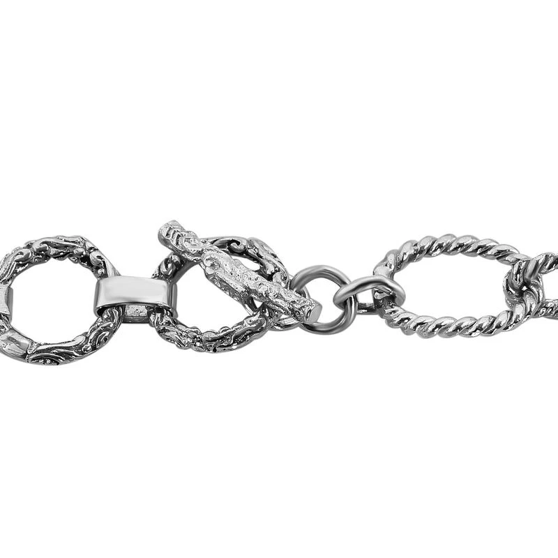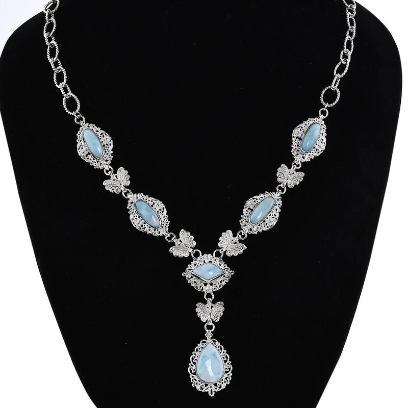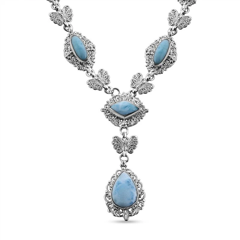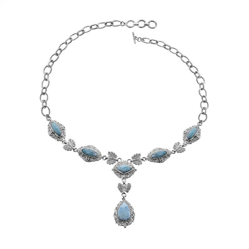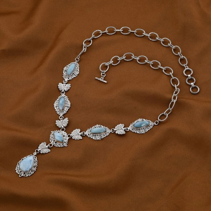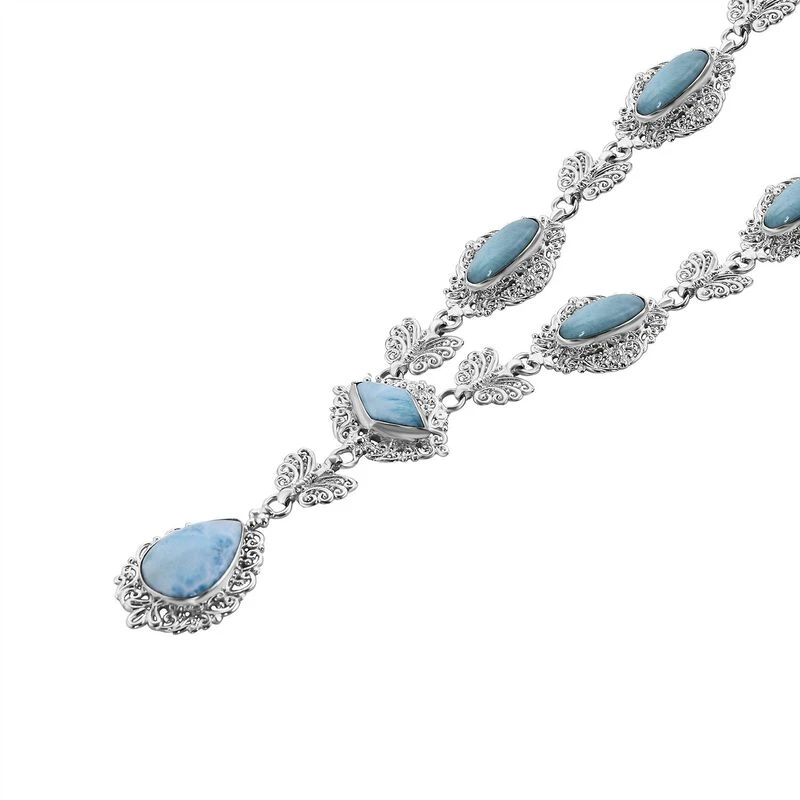 Inspiriert von der Schönheit der Natur, zeigt diese Halskette mit filigraner Arbeit, Blumen- und Schmetterlingsmotiven tadellose balinesische Handwerkskunst. 6 Larimar sitzen in einem Rahmen aus 32 Gramm Silber und fügen ihre klaren Himmelstöne hinzu, während die Halskette mit einem Knebelverschluss geschlossen wird.