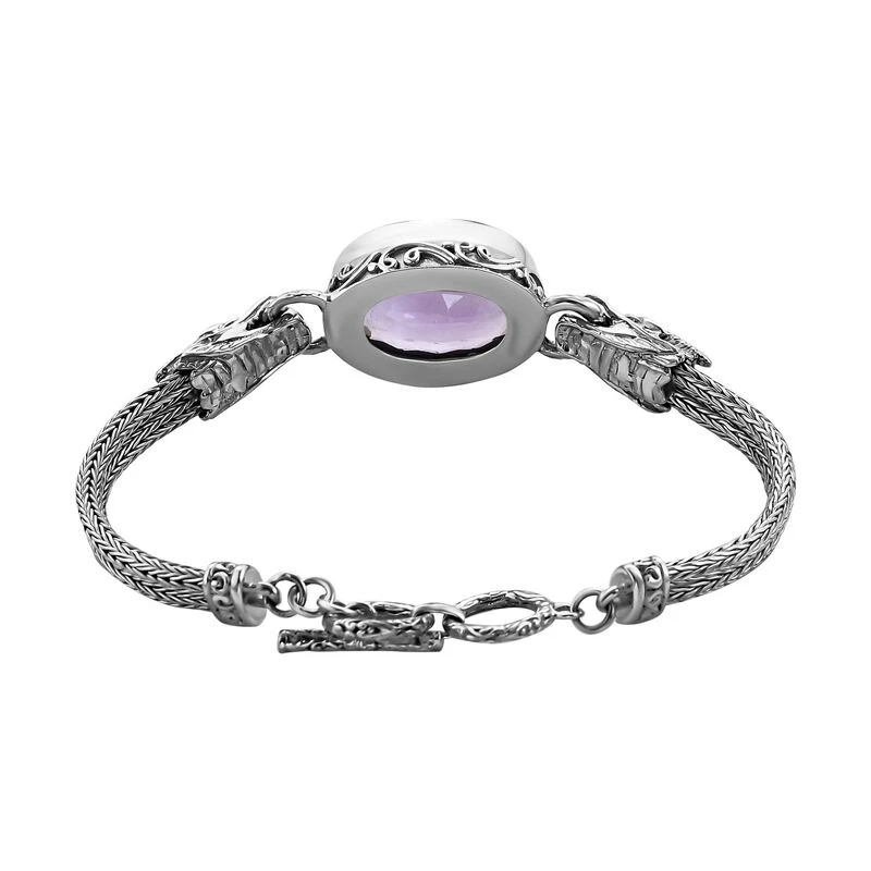 Dieses balinesische Kunsthandwerk-Armband ist mit den errötenden Farben eines Amethysten geschmückt, der von 2 Drachenköpfen und einem Tulang-Naga-Geflecht in Kettenlänge gehalten wird. Handgefertigt aus 25 Gramm Silber, wird das Armband mit einem Knebelverschluss geschlossen.