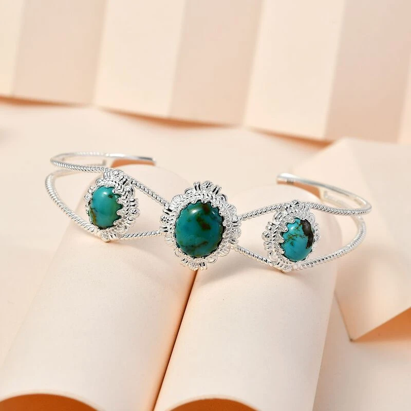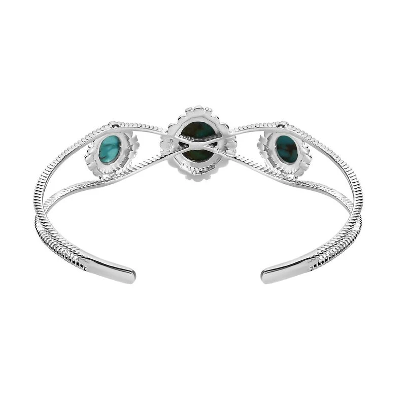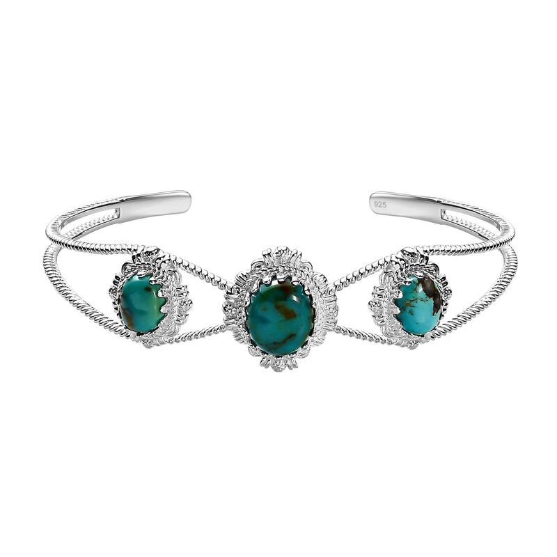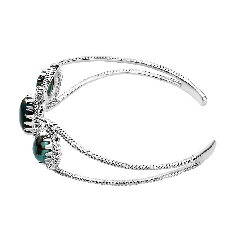 Dieser Trilogie-Armreif ist mit dem eierschalenblauen Farbton von 3 Nevada-Türkisen geschmückt, die auch eine darin enthaltene Matrix präsentieren. Der Designer-Armreif ist in 14,6 Gramm platiniertem Silber gegossen, das das einzigartige Design und die Motive dieses Armreifs für Damen hervorhebt.