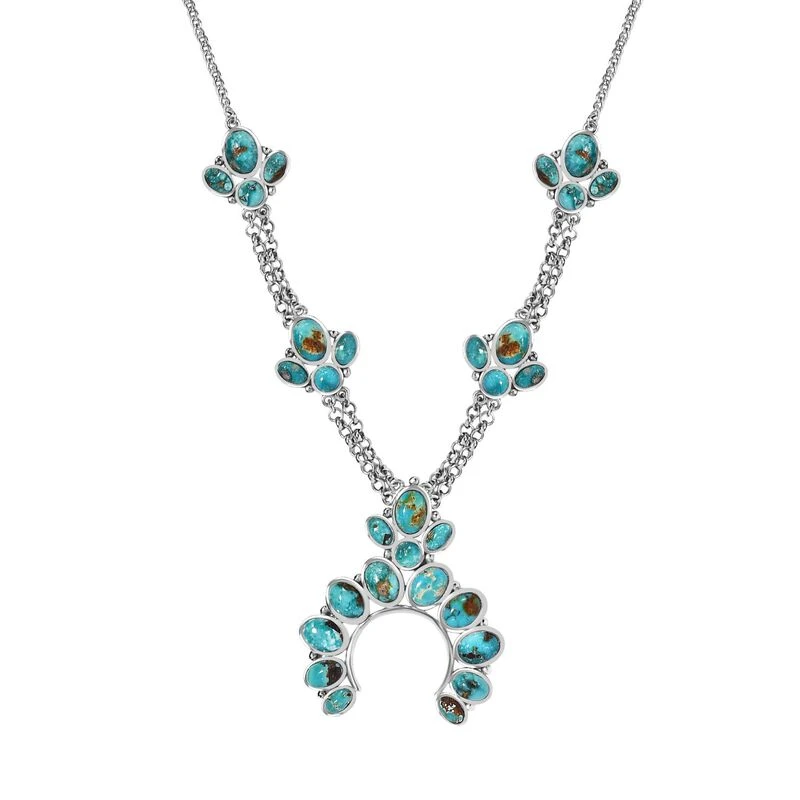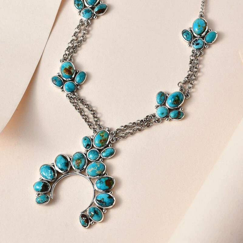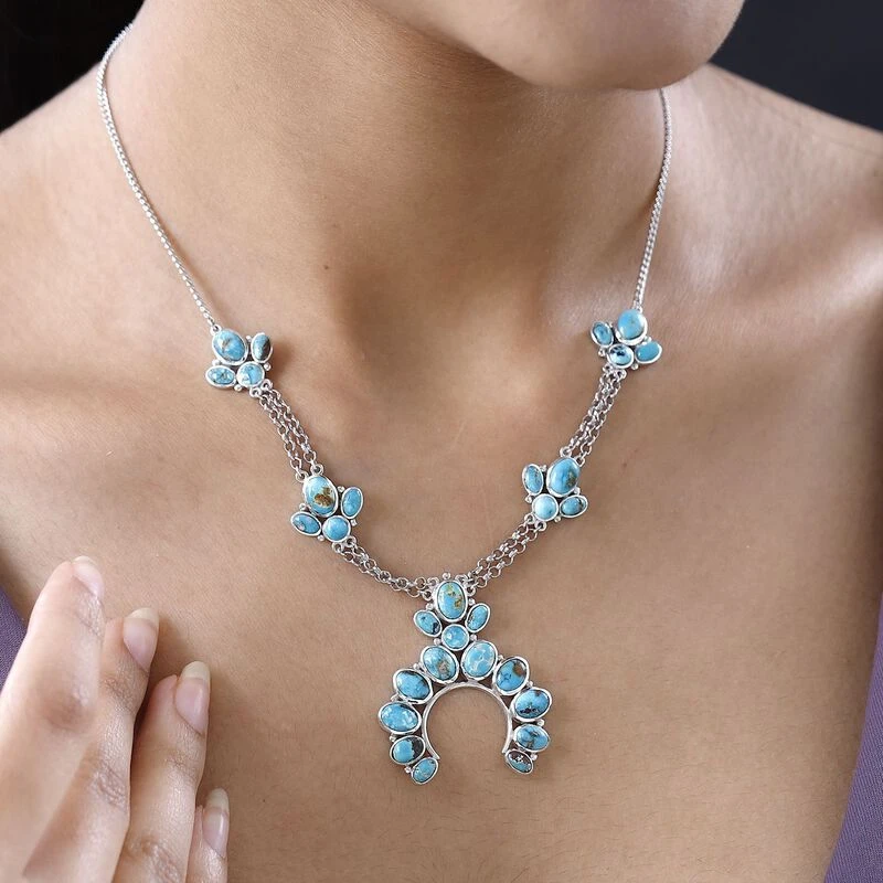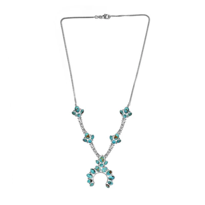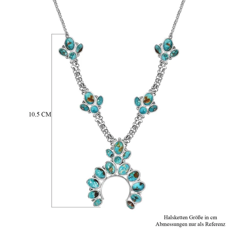 Diese Designer-Halskette für Damen ist mit der natürlichen Matrix geschmückt, die die Schönheit von 30 Türkisen zeigt. Das einzigartige Design mit dem hellen Farbton des Türkises macht diese Halskette für Damen zu einem Hit. Der Rahmen ist aus 11 Gramm platiniertem Silber gegossen und die Halskette wird mit einem Karabinerverschluss geschlossen.