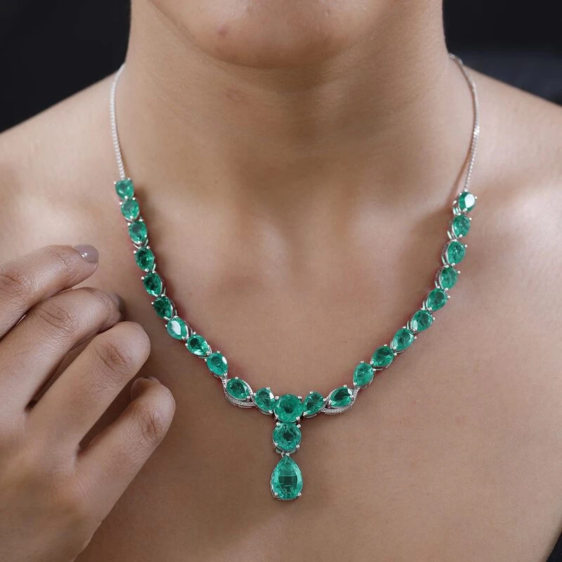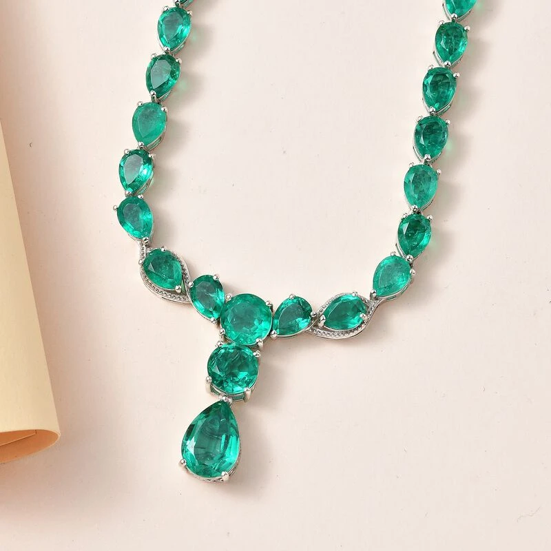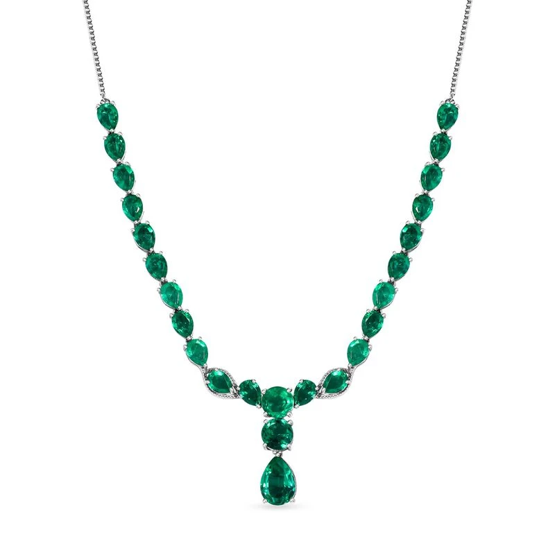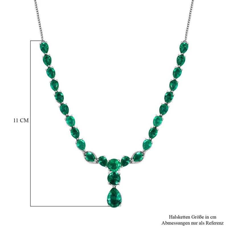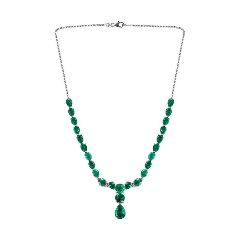 Diese elegante Halskette zeigt die Schönheit von 25 Smaragd-Quarzen, die einen tiefgrünen Farbton aufweisen. Die Y-förmige Silhouette ist aus 19 Gramm platiniertem Silber gefertigt und kann mit einem Karabinerverschluss befestigt werden.
