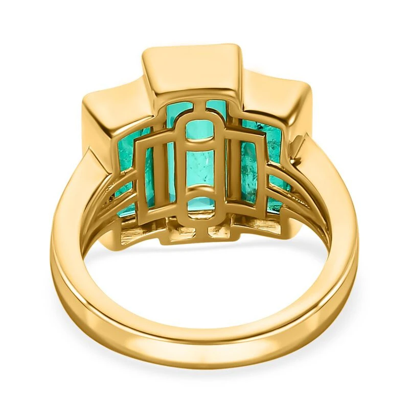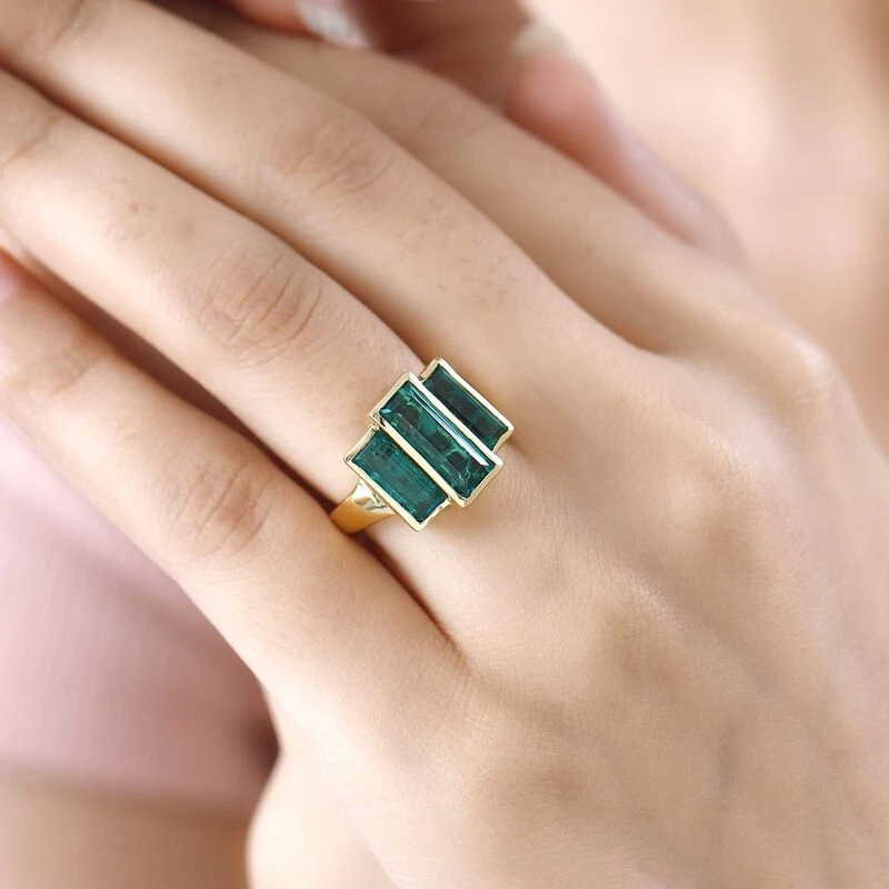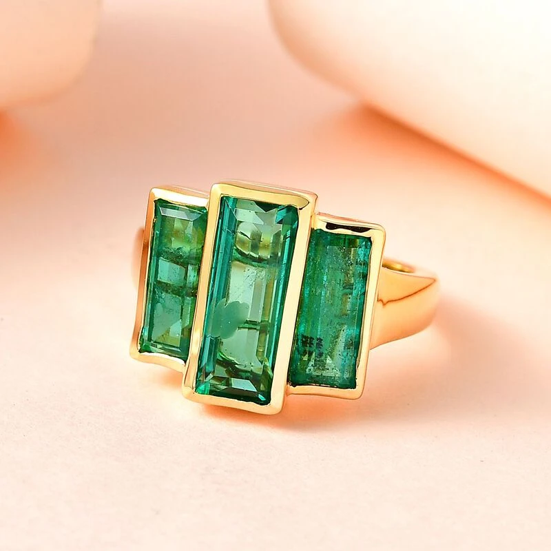 Auf der Suche nach etwas Besonderem? Dieser Designer-Ring für Damen ist im Trilogie-Muster gestaltet und bringt die lebhafte Schönheit von Triplett-Quarzen in einer Zargenfassung, die den königlichen Farbton von Smaragden einfängt. Der Cocktail-Ring für Damen ist aus 4,89 Gramm vergoldetem Silber gegossen.