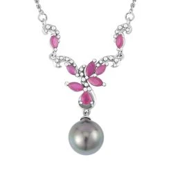 Schönheit mit Luxus: Diese Halskette ist mit den satten Farben einer Tahiti-Perle gestaltet, während die leuchtenden Farben von 8 Rubinen (Fissure gefüllt) einen zeitlosen Look verleihen. Die 4,6 Gramm Halskette ist aus rhodiniertem Silber gefertigt, das einen floralen Charme ausstrahlt.