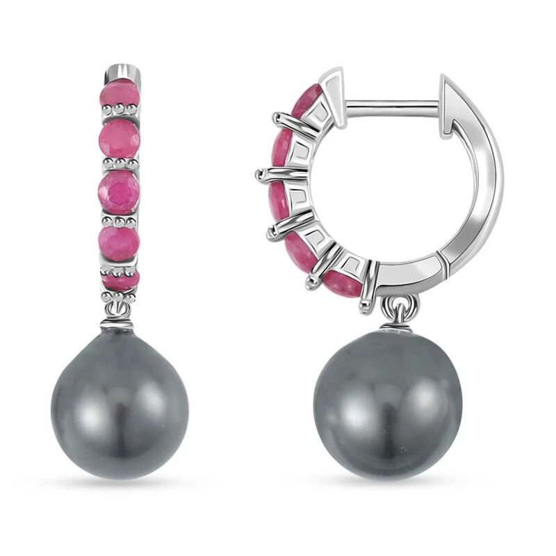 Ein wunderschönes Paar Ohrringe aus 3,7 Gramm rhodiniertem Silber. Dieses Paar kommt mit den seltenen Farben von 2 Tahiti-Perlen, die von 10 afrikanischen Rubinen (Fissure gefüllt) ergänzt werden. Die mühelose Eleganz dieser Perlen-Ohrringe für Damen kann durch einen Click-in-Verschluss gesichert werden.