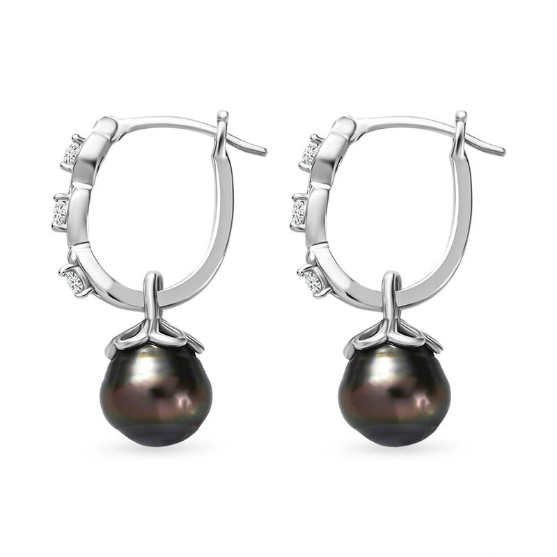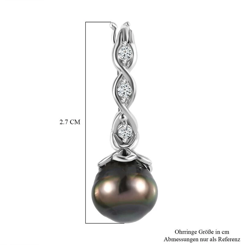 Tahiti Perle, Weißer Zirkon Ohrringe, 925 Silber Rhodiniert Ca. 0.24 Ct