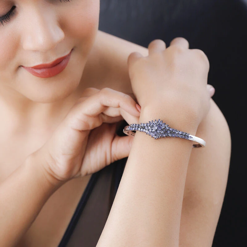 Dieser Cluster-Armreif mit floralem Muster zeigt den bezaubernden pleochroitischen Glanz von 61 Tansaniten. Der Tansanit kommt nur in Tansania vor und ist der Geburtsstein des Monats Dezember. Der Armreif ist aus 18,6 Gramm platiniertem Silber gefertigt.