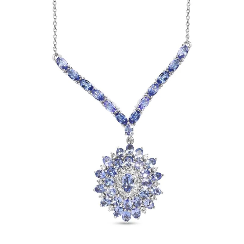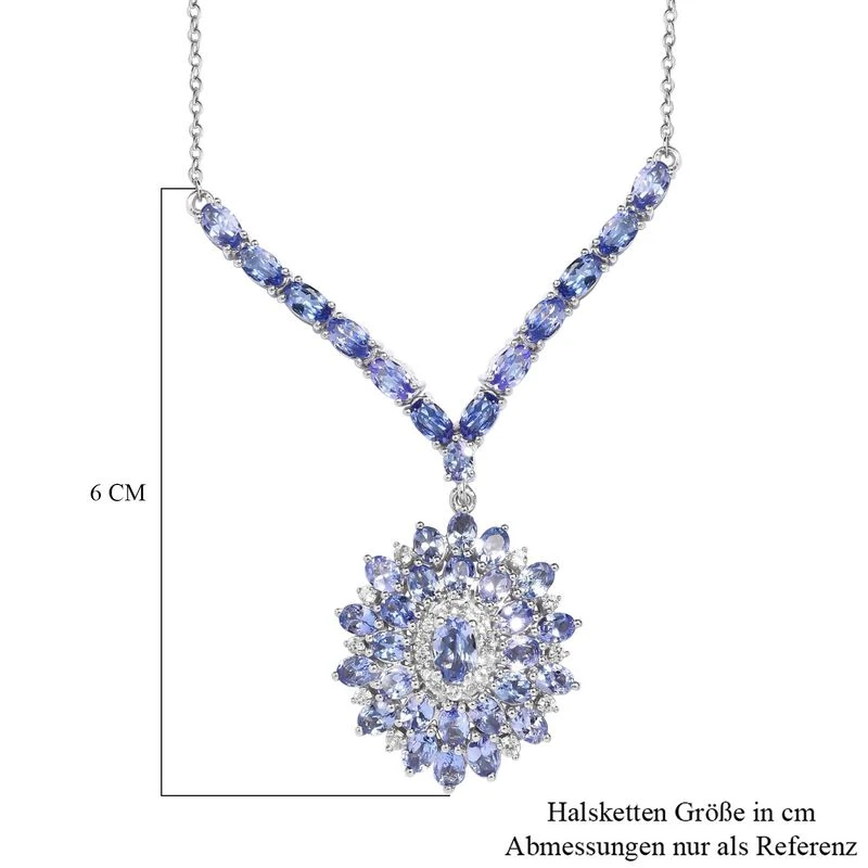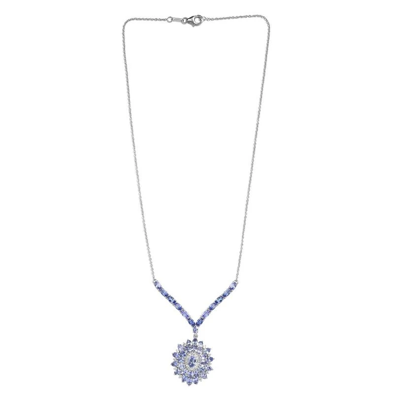 Wie eine blühende Blume bringt diese Halskette Schönheit in Ihre Looks. Die Halskette ist mit 40 Tansaniten und 24 Zirkonen besetzt und ist eine funkelnde Schönheit. Die 17,8 Gramm Halskette wird mit einem Karabinerverschluss geschlossen und ist aus platiniertem Silber gefertigt, damit sie lange schön bleibt.
