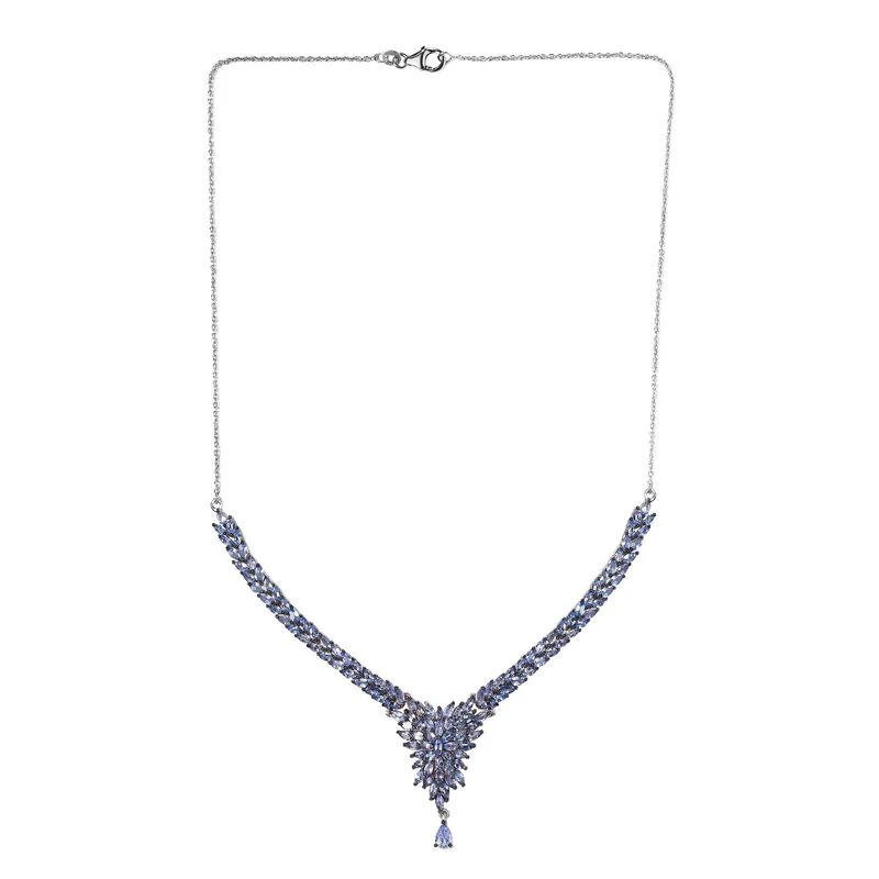 Diese Halskette blüht wie eine Blume und bringt die pleochroitischen Farbtöne von 125 Tansaniten zur Geltung. Der 1.000x seltene Edelstein, der nur in Tansania vorkommt und wegen seiner Seltenheit sehr geschätzt wird, ist hier in einem Design aus 13,9 Gramm platiniertem Silber gefasst. Der Karabinerverschluss sichert die Halskette.