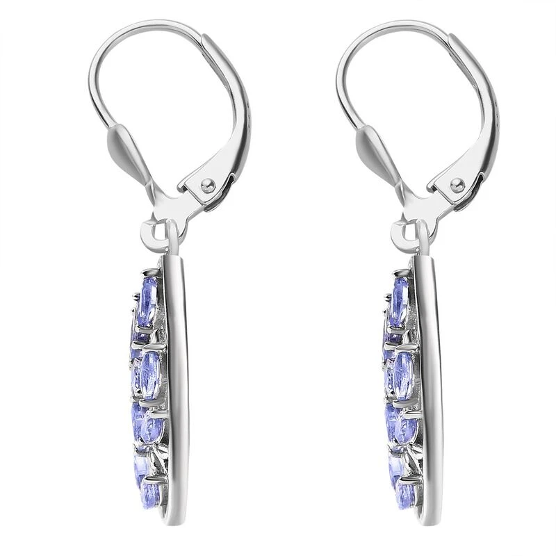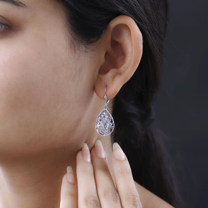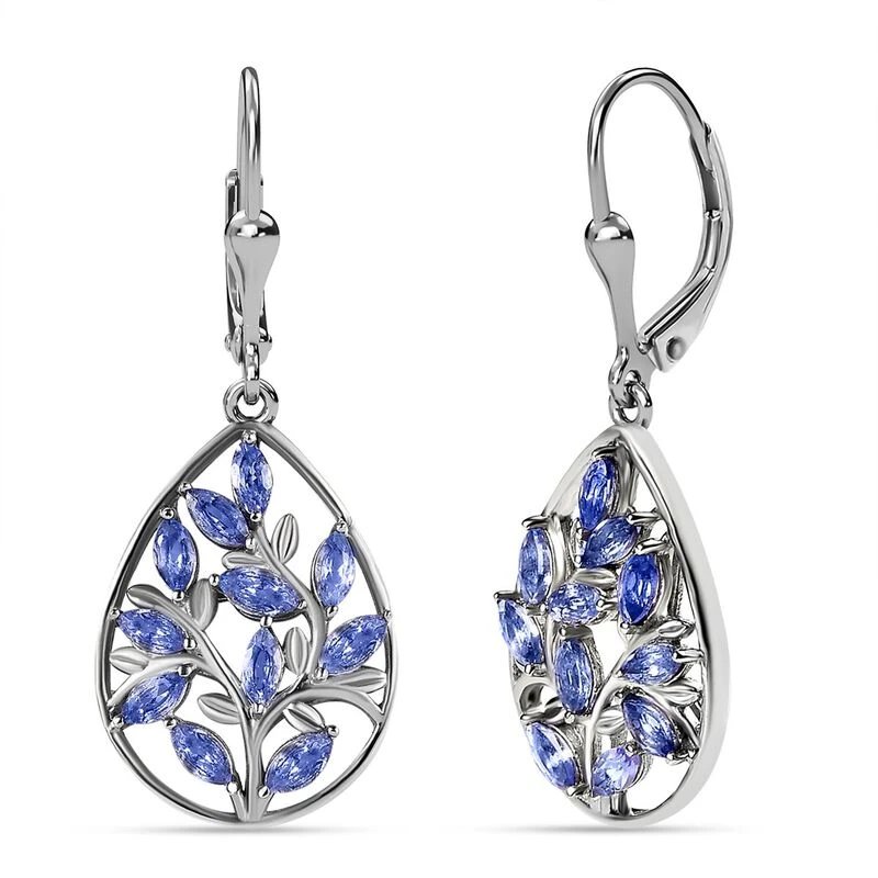 Von der Natur inspiriertes Design hat immer einen besonderen Platz, und diese Ohrhänger bringen die Schönheit von 22 Tansaniten zur Geltung, die im Design Blätter bilden. Diese 4,6 Gramm Ohrringe sind aus platiniertem Silber gefertigt und werden mit einem Klappverschluss gesichert, was ihnen einen künstlerischen Reiz verleiht.