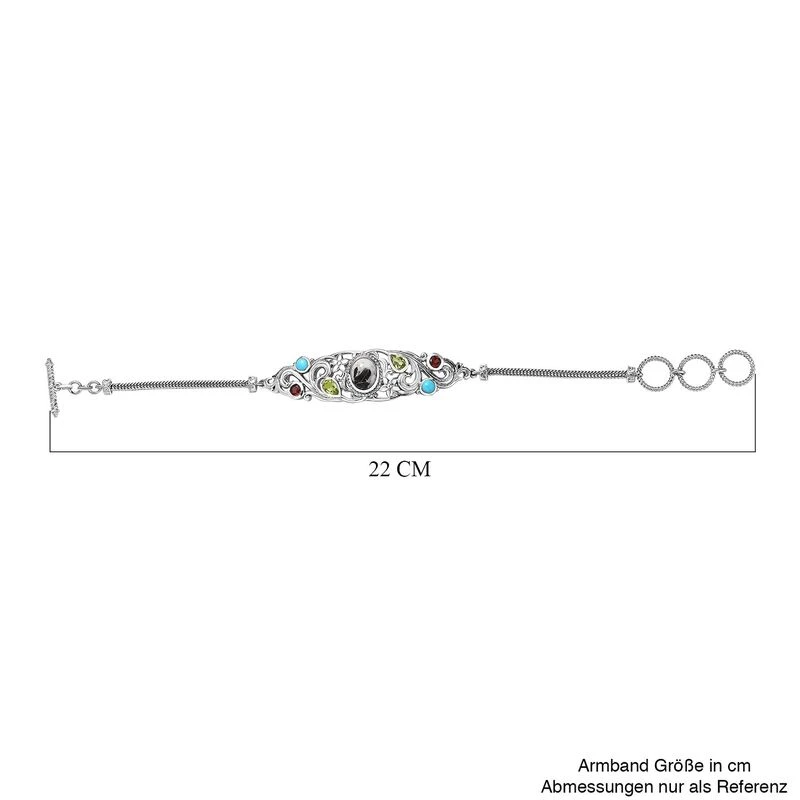 Das perfekte Designerarmband für Damen präsentiert sich hier mit der Lebendigkeit mehrerer Edelsteine, die einen Kontrast zum weißen Büffel bilden. Die kunstvollen floralen und von der Natur inspirierten Motive auf dem Design des Armbands unterstreichen seine Schönheit. Das 17,6 Gramm platinierte Silberarmband für Damen wird mit einem Knebelverschluss geschlossen.