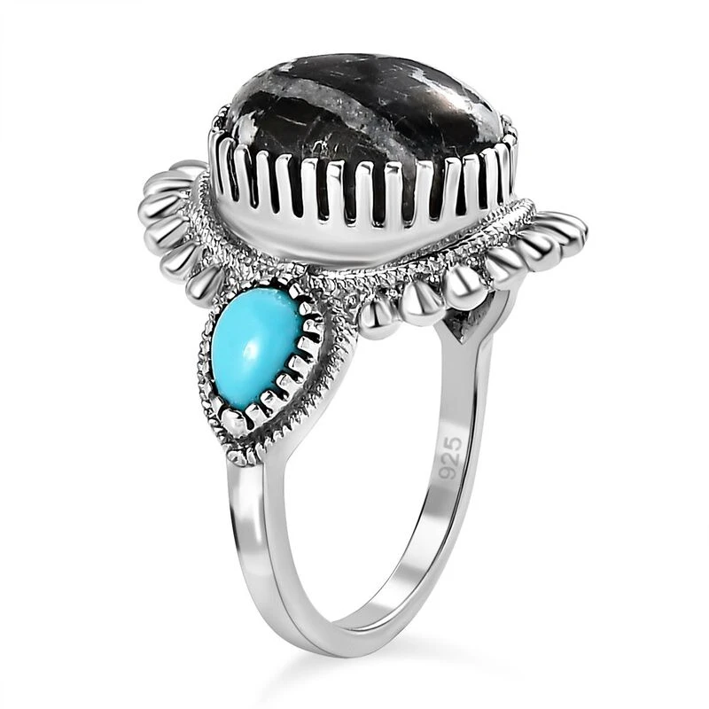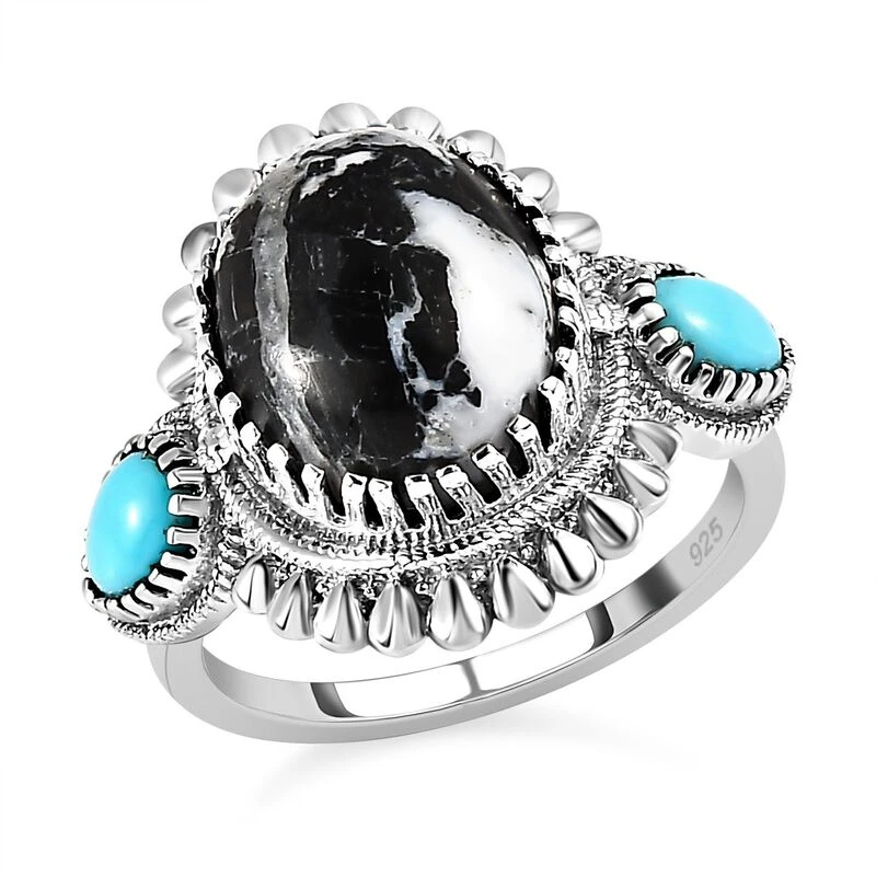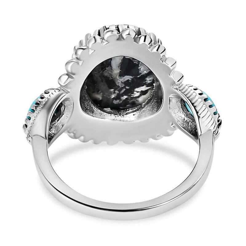 Eine gewagte Schönheit, die den Charme amerikanischer Edelsteine zeigt. Dieser Designer-Ring für Damen hat die einzigartigen Farben eines weißen Büffels, flankiert von der Lebendigkeit eines Türkises. Ein gewellter Rahmen mit Millgriff-Arbeiten fügen Schönheit zu diesem 5 Gramm platinierten Silberring hinzu.