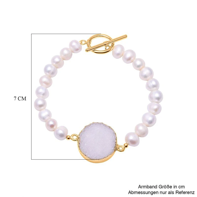 Weißes Drusen Quarz Und Weißes Süßwasserperlen-Armband, Ca. 19 Cm, Messing
